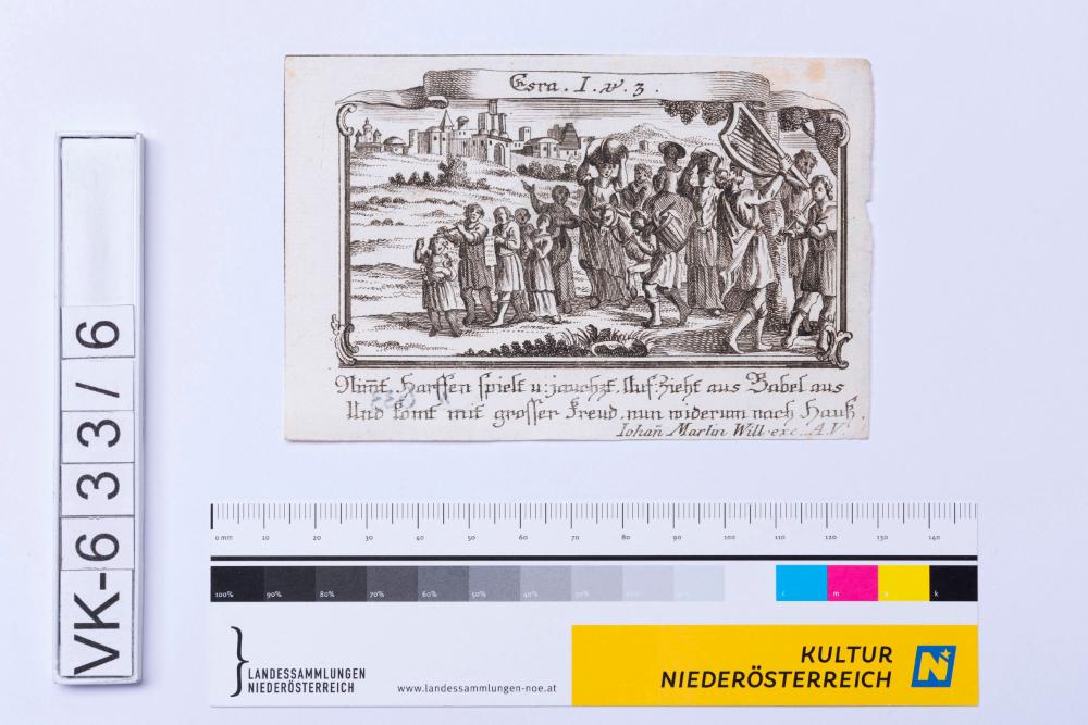 Altes Testament; Die Erlaubnis zur Heimkehr und zum Tempelbau, Beschriftung: "Nimmt Harffen speilt u: jauchzt Auf: Zieht aus Babel aus Uns komt mit grosser Freud nun widerum nach Hauß."
