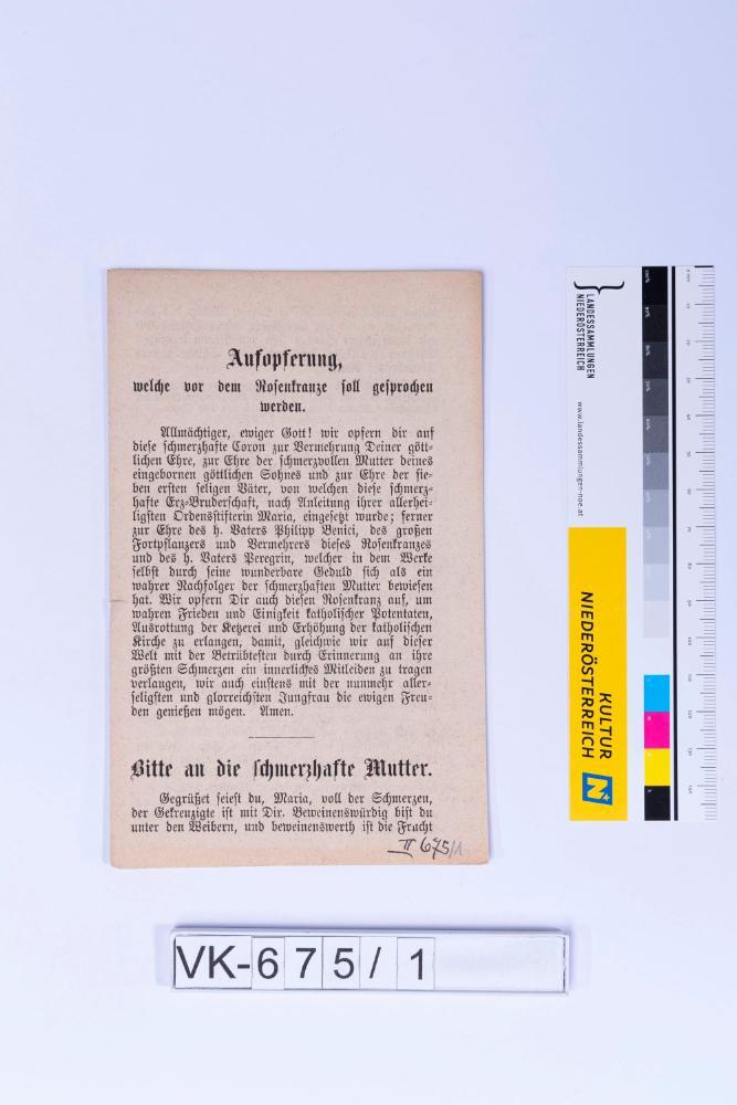 Gebetsheftchen; Vorderseite: "Aufopferung, welche vor dem Rosenkranze soll gesprochen werden.", Fürbitte; Innenseite: Gebet; Rückseite: Gebet, Vermerk "Jedesmal 100 Tage Ablaß. Wenn man durch einen ganzen Monat wenigstens 3 Mal dieses Gebet verrichtet zu verschiedenen Zeiten des Tages, einen vollkommenen Ablaß am Tage der Beichte und Communion. Pius IX. 1850.)"
