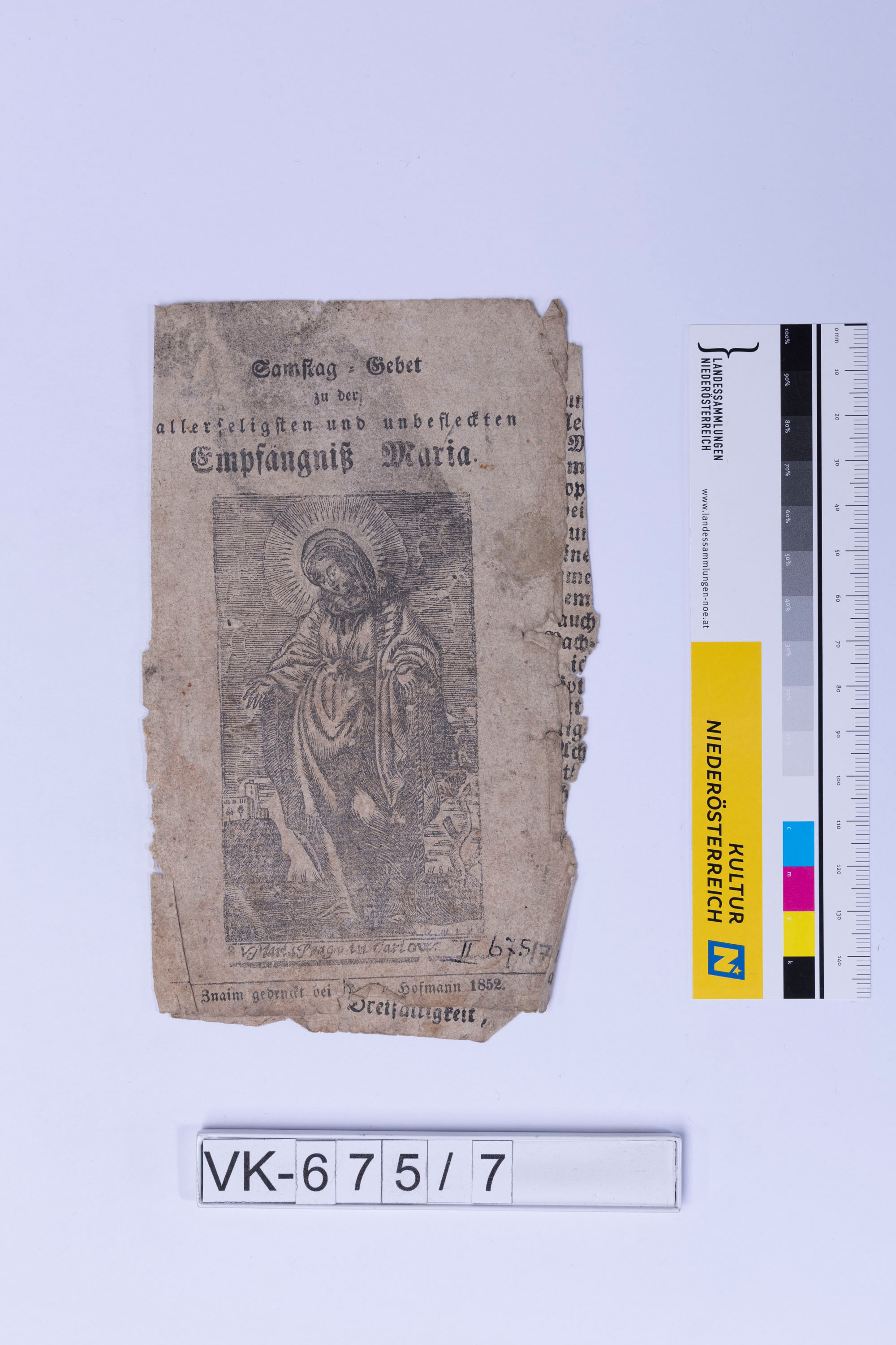 Gebetsheftchen; Vorderseite: "Samstag=Gebet zu der allerheiligsten und unbefleckten Empfängnis Maria."; Innen- und Rückseite: Gebet