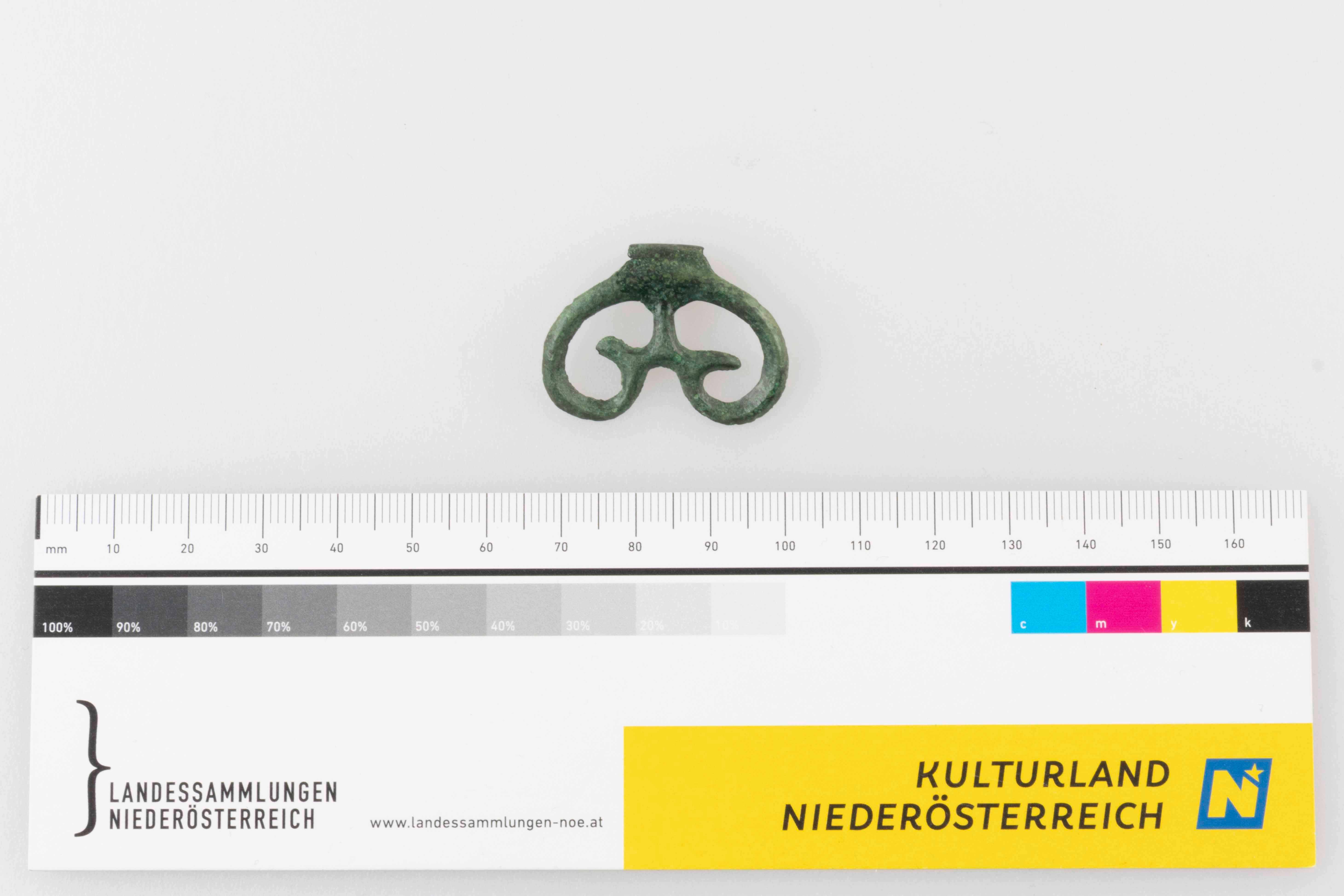 Ein verkehrt herzförmiger Anhänger aus Bronze. Die Ärmchen weisen einen dachförmigen Querschnitt auf und sind mittels eines I-förmigen Mittelstegs miteinander verbunden, der breitgehämmert und ösenartig eingerollt sowie mit einer zungenförmigen Fortsetzung versehen ist. Die Interpretation des Artefakts als Halsschmuck ergibt sich aus der Lage des Anhängers im Grab.