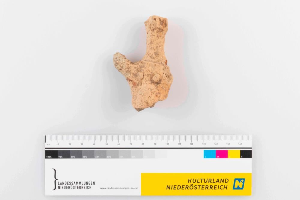 Kopf- und Oberkörperpartie eines Idols, das aus hellem, gelbbraun bis grau gebranntem Ton gefertigt ist. Die Ohren und die Nase sind durch mit den Fingern herausmodellierte Ansätze angedeutet. Der Hals ist lang und zylindrisch. Der Körper zeichnet sich durch eine im Querschnitt ovale Form aus. Der rechte Arm ist erhalten und deutet eine seitlich nach oben angewinkelte Armhaltung an. Das Ende des Arms ist abgerundet. Die Brüste sind durch kleine, runde Knubben dargestellt. Der vorhandene Teil der Bauchpartie tritt deutlich hervor und deutet auf die Darstellung einer Schwangerschaft hin.