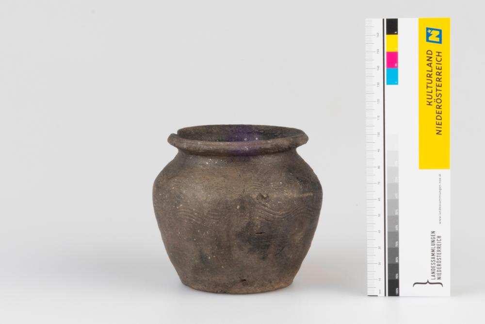 Topf; geringfügig fragmentierter Rand; Rdm. 8,0 cm, max. Dm. 10,8 cm, Bodm. 7,1 cm, H. 9,7 cm, stark silberglimmerhaltig (Korngröße bis 2 mm, gleichmäßig verteilt), Keramikgruppe D; langsam gedreht, Bodenmarke in Form eines halben unregelmäßigen Sterns, innen starke, waagrechte Verstreichspuren und ein Absatz knapp über dem Boden, ausladender, schräg abgestrichener Rand mit umlaufender Rille, ausgeprägter Bauchumbruch; auf Schulter und Bauch mit mehrfachen Wellenlinien verziert, der Gefäßunterteil trägt mehrere umlaufende Linienbänder; Farbe: dunkelgrau und braungrau, Mischbrand
