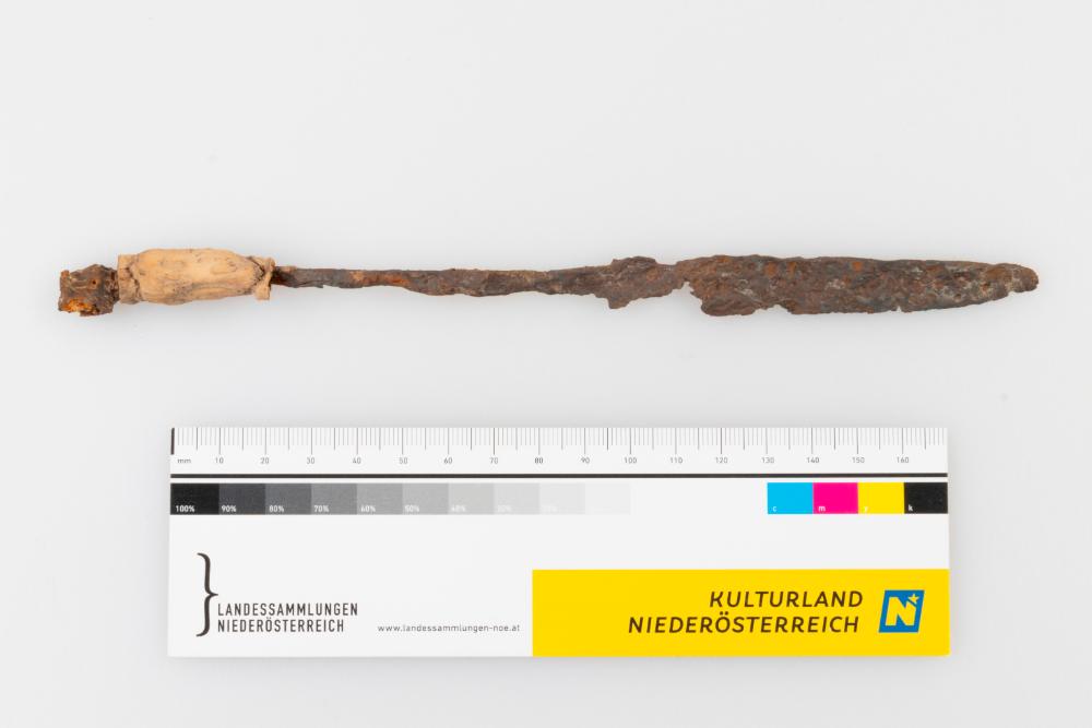 Griffangelmesser aus Eisen; Schneide fragmentiert, Spitze fehlt, auf der Griffangel geringe Holzreste und darüber Teile eines Beingriffes erhalten; extrem verlängerte Griffangel, Rücken sehr leicht und Klinge etwas abgesetzt, Rücken fällt nach ca. 5 cm leicht zur oberständigen Spitze ab; L. 21,5 cm, davon GriffangelL. 11,9 cm, KlingenB. 1,3 cm, RückenB. 0,35 cm, GriffangelQu. rechteckig sowie quadratisch, erh. BeingriffQu. abgerundet rechteckig