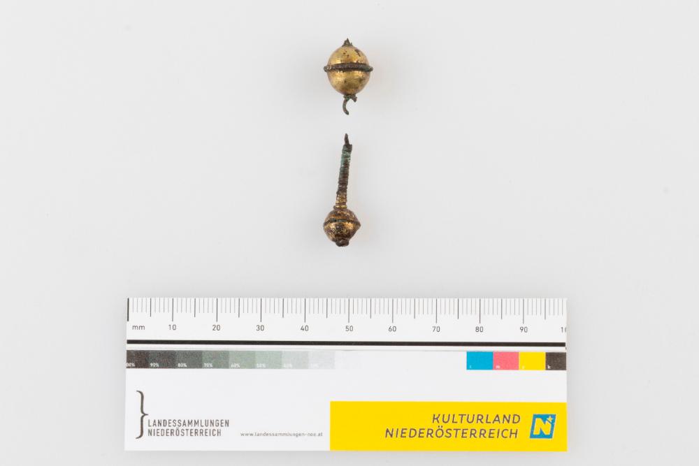 Bommelohrring; Kupfer vergoldet; fragmentiert; auf Drahtschlaufe aufgeschobener Bommel aus horizontal zusammengesetzten Blechhälften; Kettchen (um Draht gewickelter Draht) mit eingedrückter, ebenso konstruierter Blechbommel; erh. L. 1,7 und 2,6 cm, BommelDm. 1,1 und 0,85 cm