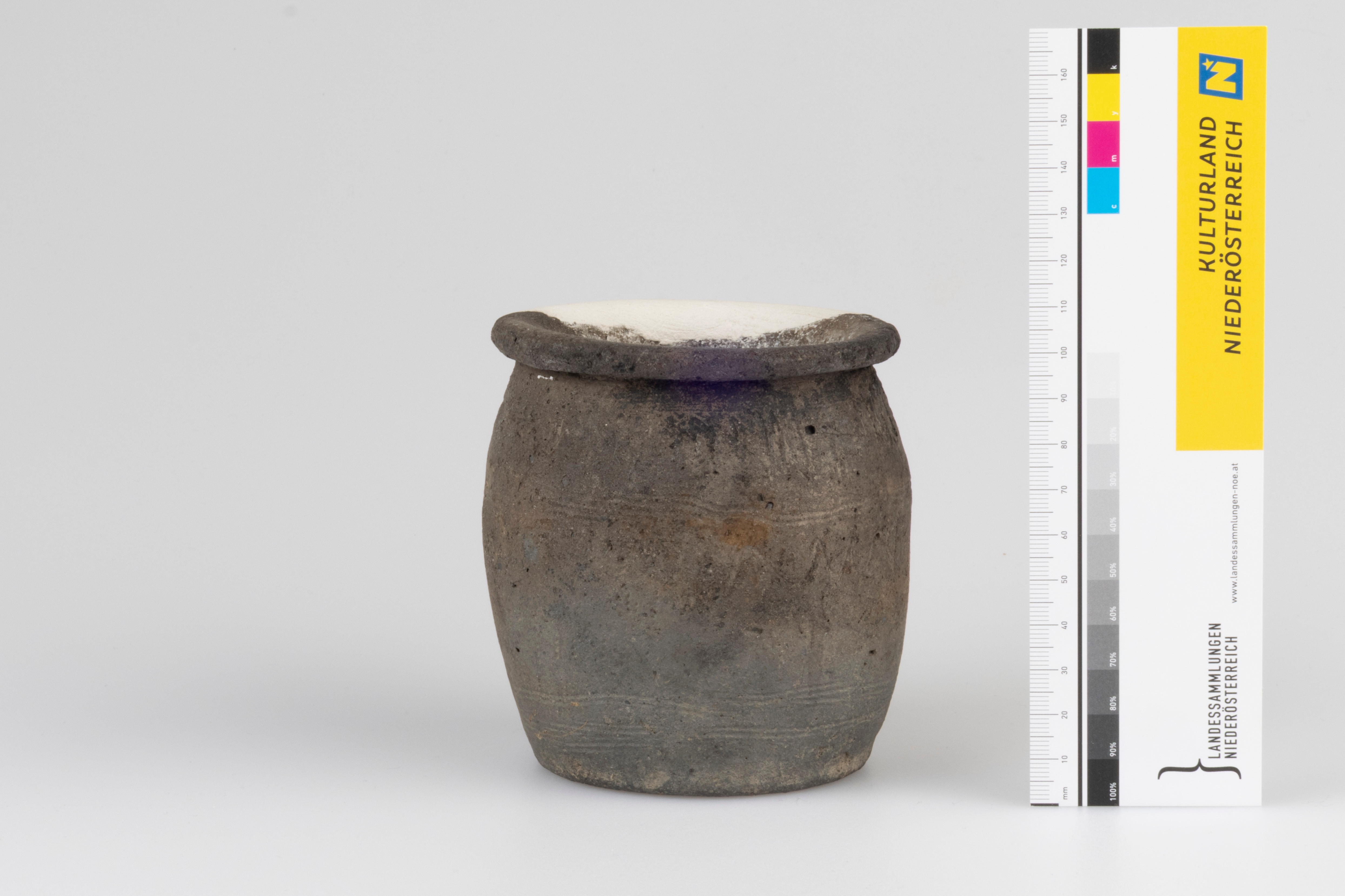 Topf; beinahe vollständig erhalten; Rdm. 9,1 cm, max. Dm. 9,3 cm, Bodm. 7,4 cm, H. 10,1 cm, graphithaltig, Keramikgruppe A; langsam gedreht, innen waagrechte Verstreichspuren, Wülste zum Teil noch sichtbar, sternförmige Bodenmarke, waagrecht ausladender, abgerundeter Rand, auf der Schulter mehrzeiliges, durch schräge bis senkrechte Kerben unterbrochenes Wellenband, am Bauch ein mehrzeiliges Linien- und ein einzeiliges Wellenband und am Gefäßunterteil umlaufende senkrechte Kammstichzier und zwei mehrzeilige umlaufende Linienbänder; Farbe: hellgrau und hellbraun, reduzierend gebrannt, Oberteil sekundär gebrannt