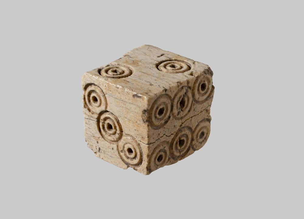 Ein kleiner, gezinkter Spielwürfel. Die Augenzahlen, die durch doppelte Kreisaugen dargestellt sind, zeigen zweimal die Zahl sechs, während die Eins fehlt. Die gleichen Zahlenwerte sind auf gegenüberliegenden Seiten angeordnet.
