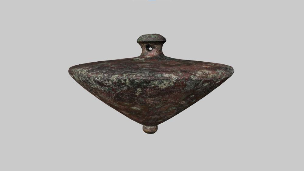 Breites, kegelförmiges Lot mit einer knopfartigen, gelochten Aufhängevorrichtung und einer kleinen, knopfartigen Verdickung an der unteren Spitze.