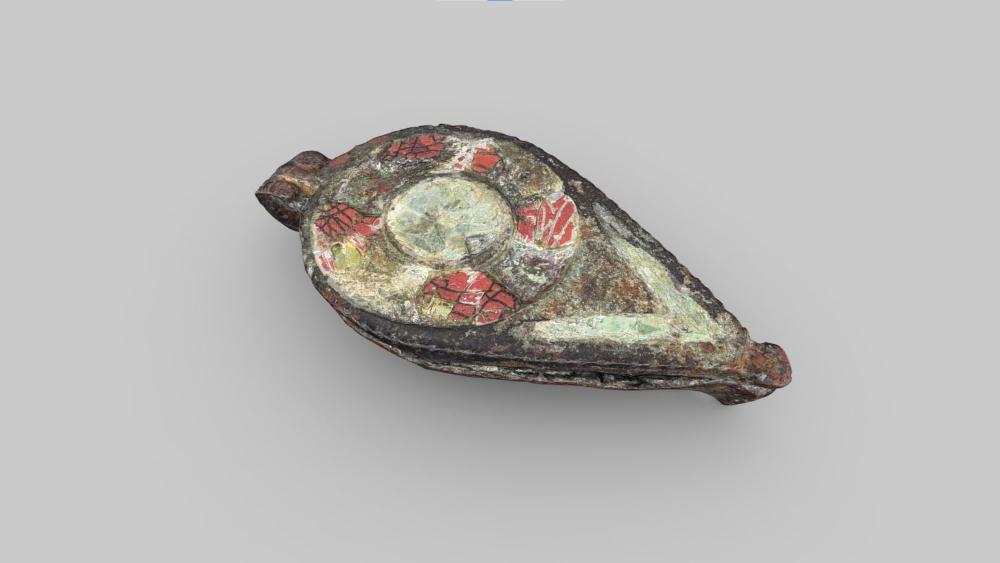 Eine blattförmige Siegelkapsel mit Backenscharnier. Auf dem Deckel ist eine kreisrunde Scheibe in zwei konzentrische Felder unterteilt. Das äußere Kreisfeld ist symmetrisch mit roten und blauen Emailfeldern ausgelegt. Das zentrale Kreisfeld ist mit blauem Email ausgelegt. In der Deckelspitze ist ein V-förmiges Muster mit blauem Email ausgefüllt. Entlang des Deckelrandes verlaufen feine Einkerbungen. Der Boden der Dose ist dreifach gelocht.
