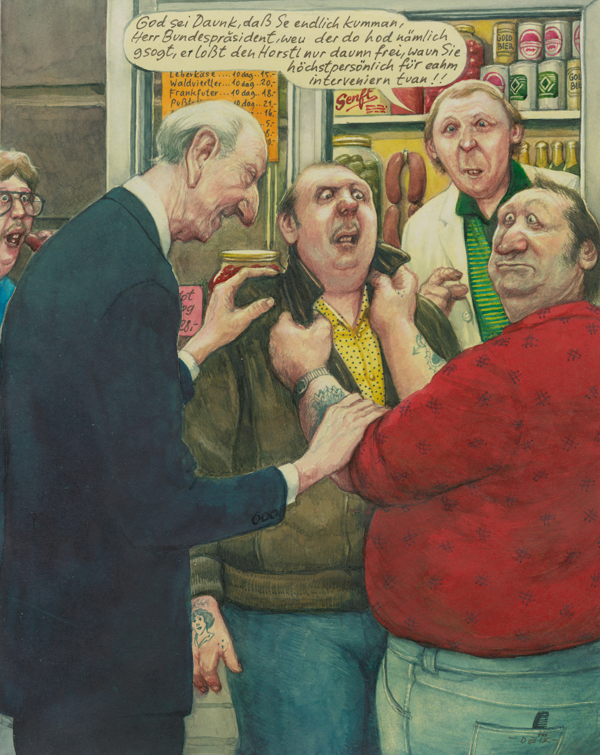 Geiselbefreier Waldheim – Seine erfolgreiche Irak-Mission hat Bundespräsident Waldheim ermutigt, auch an heimischen Krisenherden als Friedensvermittler einzugreifen (z.B. Krisenherd Würstelstand, Wien 15)