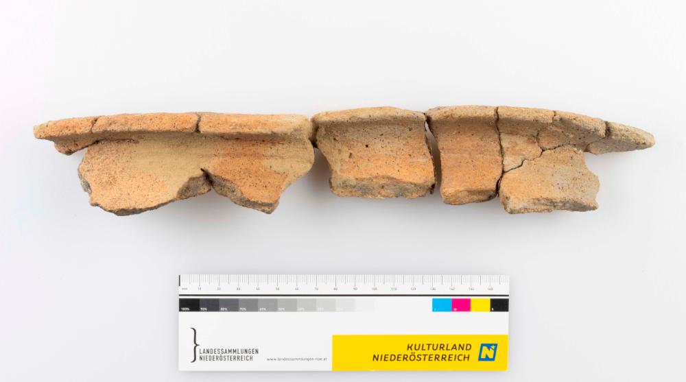 Randpartie von großem Gefäß mit Ansatz des Schulter-Hals-Umbruchs, niedrigem, annähernd senkrechtem Hals und gerade nach außen gezogenem Rand. Umlaufende Drehrille am Hals. Mehrere Fragmente desselben Gefäßes, teils zusammengeklebt. Erh. H. ca. 5,2 cm; Randdm. ca. 22 cm.
