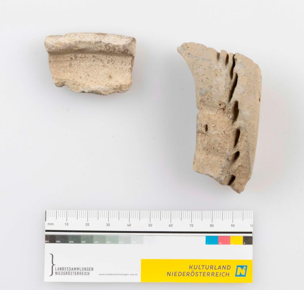 1 Henkelfragment mit Kerben-Zier, 1 Randscherben ( Kragenrand) Wandscherben: fette Graphitkeramik, reduzierend gebrannt