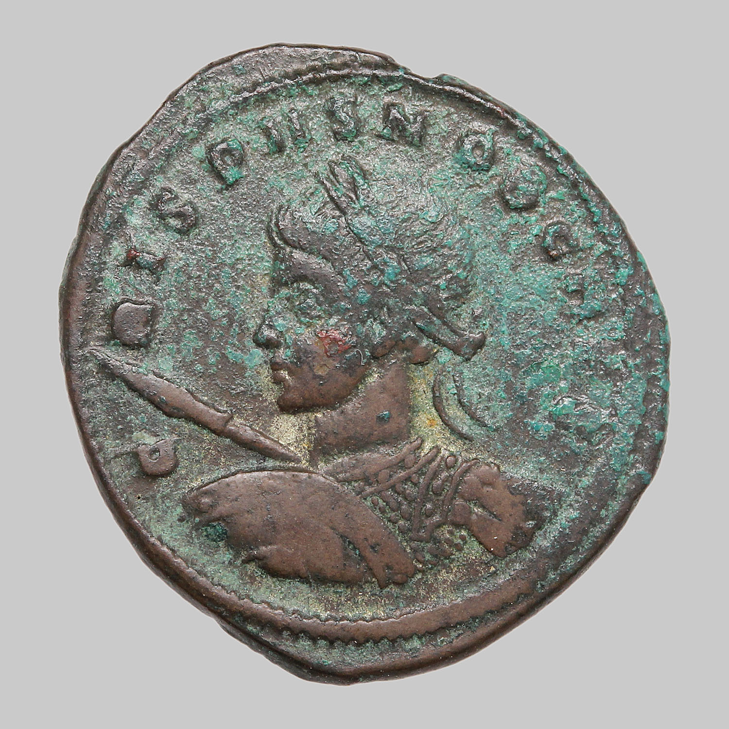 Drapierte und gepanzerte Büste mit Lorbeerkranz n. l., hält Speer in der Rechten und Schild in der Linken
