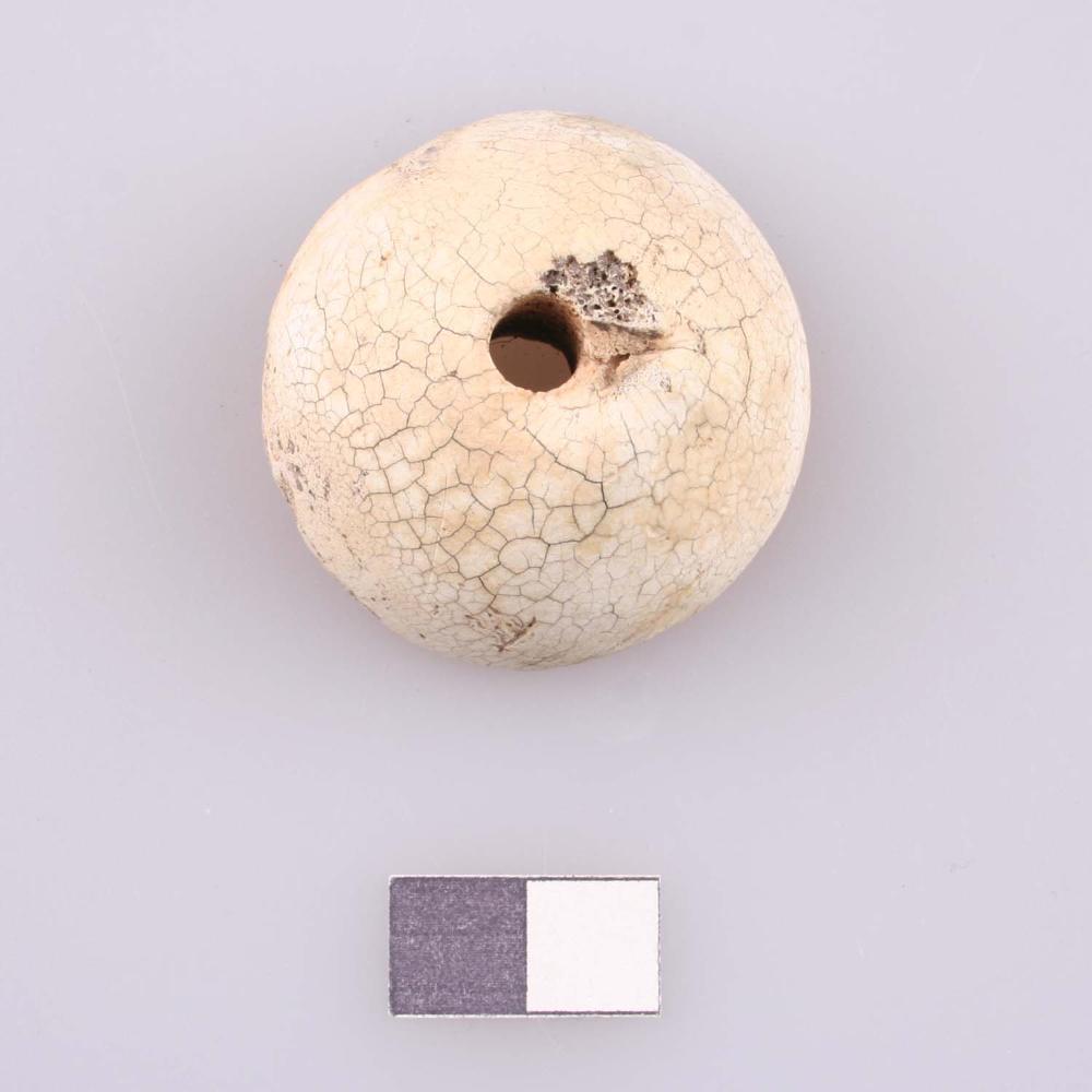Durchlochte, halbkugelige Knochenscheibe mit runden Einstichen an der Unterseite