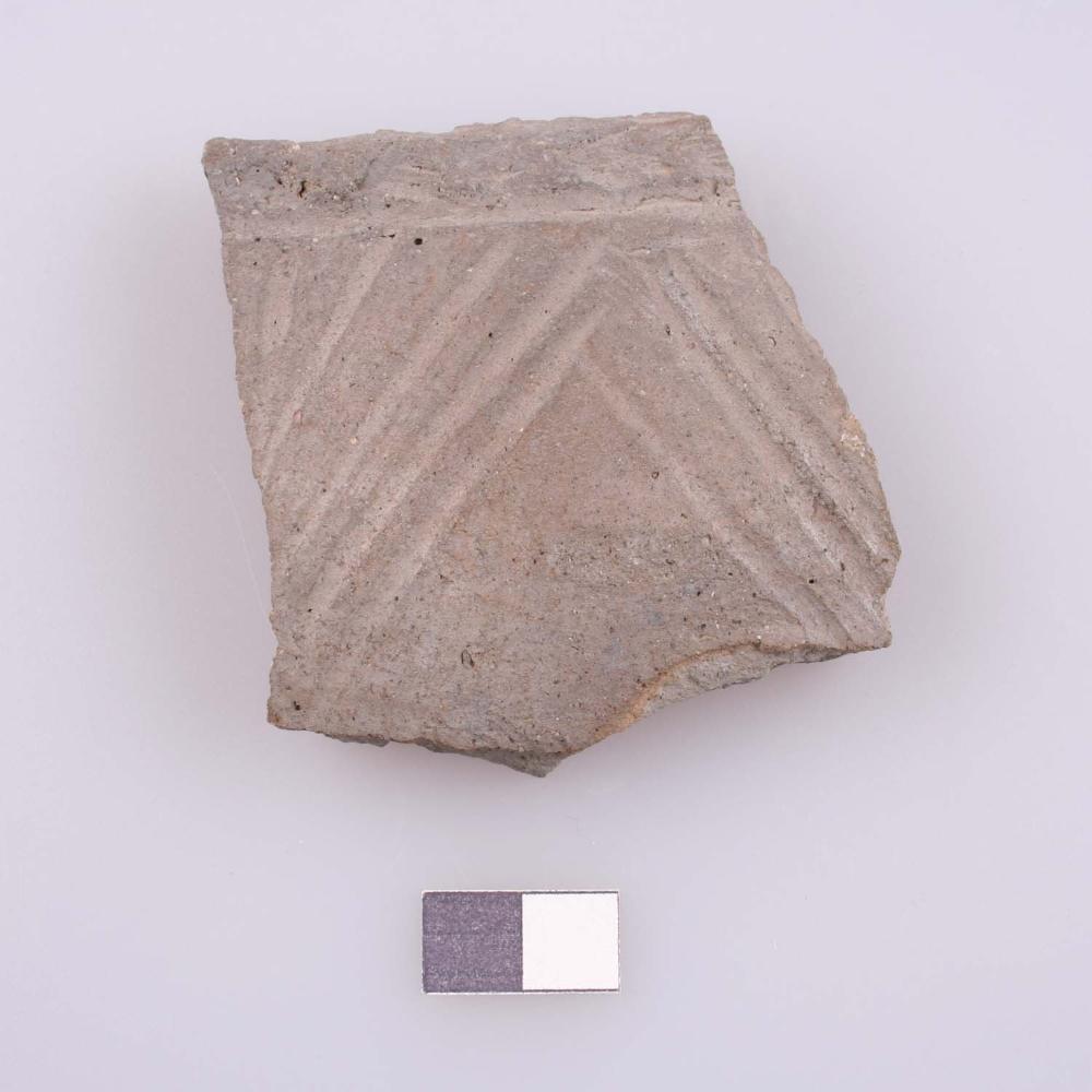 Wandbruchstück mit umlaufender Fingertupfenleiste und darunter umlaufenden, schrägen, winkelförmigen Riefengruppen