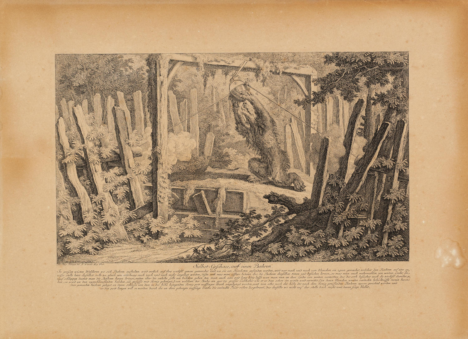 Signaturunten bedruckt: "Joh. Elias Ridinger del. fec. et excud. Aug. Vind. / Selbst=Geschoss, auf einen Baehren. / In grossen wüsten Waelderen wo sich Baehren aufhalten wird erstlich auf ihre wechsel genau gemercket und wo sie am stärcksten gefunden werden, wird nur nach und nach von blancken ein zaun gemachet, welcher den Baehren auf eine ge= / wisse stelle leitet daselbst solle zu gleich eine erhöhung auch nach und nach mehr angelegt werden, disen orth mus man öffters luderen das die Baehren denselben kenen und besuchen lernen, so mus man auch mehrmahlen von weitem Luder da= / rauf schleppen damit man die Baehren herzu bringe, mitten über die anhöhe solle ein balcken gehen den man auch eine zeit lang ledig lasse wan man nun an dem Luder von weitem vernommen das der orth besuchet auch die Wechsel darüber ge= / hen, so wird an den zwerchlauffenden balcken, ein gefaesse mit Honig gehenget, /: von welchem der Baehr ein gar zu grosser Liebhaber wie er es dan schon im winde weit vernimmt :\ an denen blancken werden verdeckte behältnüsse darein beson= / ders gemachte büchsen geleget an deren schlosse von dem in der höhe hangenden Honig pott messinger drath angehengt worden, wann nun alles nach der höhe des nach dem Honig greiffenden Baehren zuvor gerichtet worden und / er den pott langen will so werden durch die an ihne gehengte messinge draethe die verdeckte Feuer röhre losgebrant, das derselbe wo nicht auf der stelle doch nicht weit davon sizen bleibet."