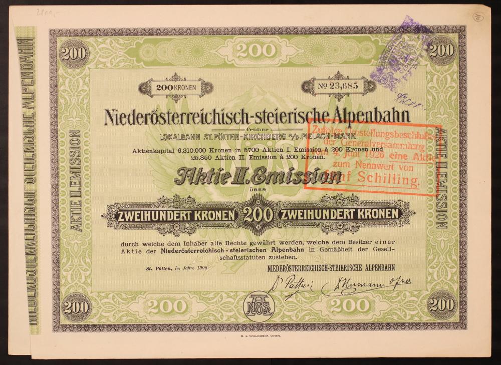 200 Kronen, No. 23,685. Niederösterreichisch-Steierische Alpenbahn früher Lokalbahn St. Pölten-Kirchberg a/d. Pielach-Mank. Aktienkapital 6,310,000 Kronen in 5700 Aktien I. Emission à 200 Kronen und 25.850 Aktien II. Emission à 200 Kronen. Aktie II. Emission über 200 Kronen durch welche dem Inhaber alle Rechte gewährt werden, welche dem Besitzer einer Aktie der Niederösterreichisch-Steierischen Alpenbahn in Gemäßheit der Geselschaftstatuten zustehen. St. Pölten im Jahre 1908. Niederösterreichisch-Steierische Alpenbahn [Unterschriften unleserlich].“ Roter Stempel im rechten oberen Bereich: „Zufolge Umstellungsbeschluss der Generalversammlung vom 4. Juni 1926 eine Aktie zum Nennwert von fünf Schilling.