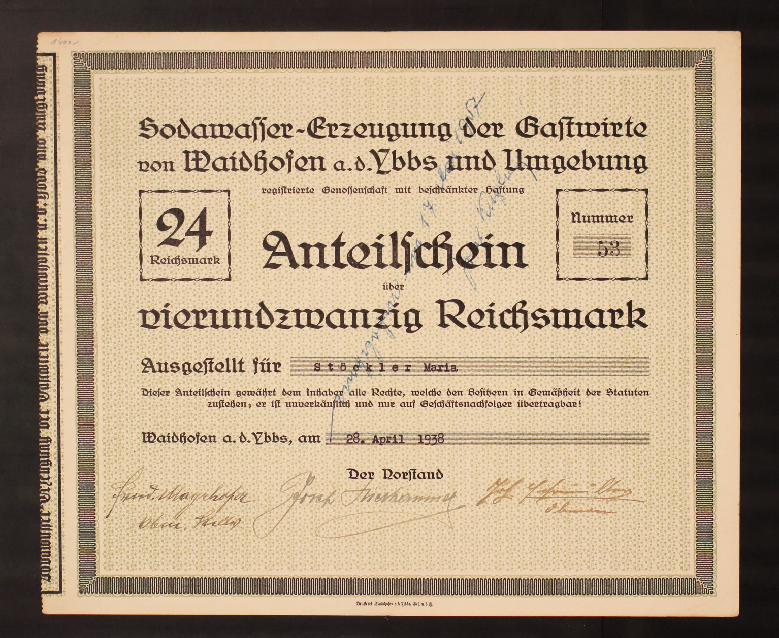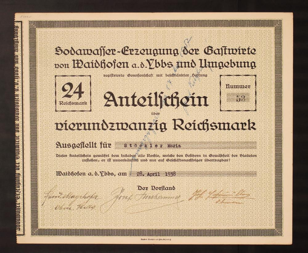 Sodawasser - Erzeugung der Gastwirte von Waidhofen a. d. Ybbs und Umgebung registrierte Genossenschaft mit beschränkter Haftung. 24 Reichsmark, Nummer 53. Anteilscheinüber vierundzwanzig Reichsmark. Ausgestellt für Stöckler Maria. Dieser Anteilschein gewährt dem Inhaber alle Rechte, welche den Besitzern in Gemäßheit der Statuten zustehen, er ist unverkäuflich und nur auf Geschäftsnachfolger übertragbar! Waidhofen a. d. Ybbs, am 28. April 1938. Der Vorstand: [Unterschriften unleserlich].