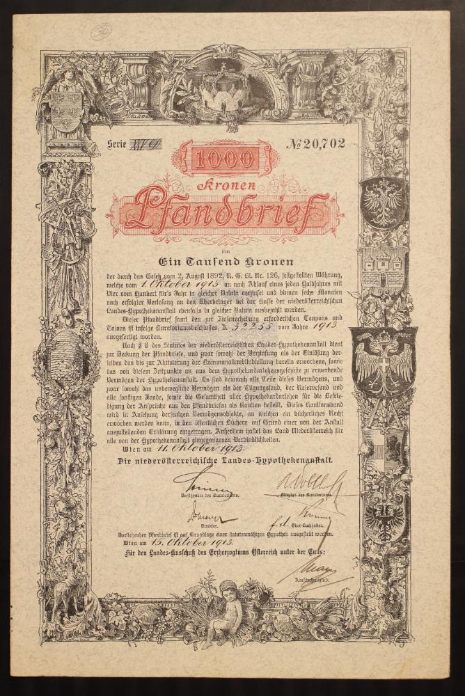 Serie XXV D, No. 20,702. 1000 Kronen Pfandbrief über Ein Tausend Kronen der durch das Gesetz vom 2. August 1892, R.G.Bl. Nr. 126, festgestellten Währung, welche vom 1. Oktober 1913 an nach Ablauf eines jeden Halbjahres mit Vier vom Hundert für's Jahr in gleicher Valuta verzinset und binnen sechs Monaten nach erfolgter Verlosung an den Überbringer bei der Kasse der niederösterreichischen Landes-Hypothekenanstalt ebenfalls in gleicher Valuta ausbezahlt werden. Dieser Pfandbrief samt den zur Zinserhebung erforderlichen Coupons und Talons ist infolte Kuratoriumsbeschlusses, B. 32255 vom Jahre 1913 ausgefertigt worden. Nach §3 des Statutes der niederösterreichischen Landes-Hypothekenanstalt dient zur Deckung der Pfandbriefe, und zwar sowohl der Verzinsung als der Einslösung derselben das bis zur Aktivierung der Kommunalkreditabteilung bereits erworbene, sowie das von diesem Zeitpunkte an aus dem Hypothekardarlehensgeschäfte zu erwerbende Vermögen der Hypothekenanstalt. Es sind demnach alle Teile dieses Vermögens, und zwar sowohl das unbewegliche Vermögen als der Tilgungsfond, der Reservefond und alle sonstigen fonde, sowie die Gesamtheit aller Hypothekardarlehen für die Befriedigung der Ansprüche aus den Pfandbriefen als Kaution bestellt. Dieses Kautionsband wird in Ansehung derjenigen Vermögensobjekte, an welchen ein bücherliches Recht erworben werden kann, in den öffentlichen Büchern auf Grund einer von der Anstalt auszustellenden Erklärung eingetragen. Außerdem haftet das Land Niederösterreich für alle von der Hypothekenanstalt eingegangenen Verbindlichkeiten. Wien, am 11. Oktober 1913. Die niederösterreichischen Landes-Hypothekenanstalt. Vorsitzender des Kuratoriums: [Unterschrift unleserlich]. Direktor: [Unterschrift unleserlich]. Mitglied des Kuratoriums: [Unterschrift unleserlich]. Ober-Buchhalter: [Unterschrift unleserlich]. Wien, am 15. Oktober 1913. Für den Landes-Ausschuß des Erzerhogtums Österreich unter der Enns: Ausschußmitglied: [Unterschrift unleserlich].“