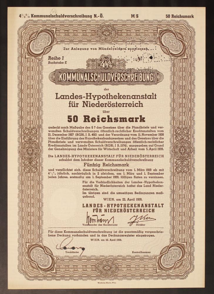 Lochschrift: „MUSTER Waldheim-Eberle WIEN“. Text: „4 ½ % Kommunalschuldverschreibung N.-Ö. M/S 50 Reichsmark. Zur Anlegung von Mündelgeldern zugelassen. Reihe 1, Buchstabe E, [ohne Nummer]. Kommunlschuldverschreibung der Landes-Hypothekenanstalt für Niederösterreich über 50 Reichsmark gedeckt nach Maßgabe des §7 des Gesetzes über die Pfandbriefe und verwandten Schulverschreibungen öffentlich-rechtlicher Kreditanstalten vom 21. Dezember 1927 (RGBl. S. 492 ) imd der Verordnung vom 11. November 1938 über die Einführung des Hypothekenbankgesetzes und des Gesetzes über die Pfandbriefe und verwandten Schuldverschreibungen öffentlich-rechtlicher Kreditanstalten im Lande Österreich (RGBl. I S. 1574), ausgegeben auf Grund der Genehmigung des Ministers für Wirtschaft und Arbeit vom 5. April 1939. DieLandes-Hypothekenanstalt für Niederösterreich schuldet dem inhaber dieser Kommmunalschuldverschreibung Fünfzig Reichsmark und verpflichtet sich, diese Schuldverschreibung vom 1. März 1939 ab mit 4 ½ % jährlich, nachträglich in 2 gleichen, am 1. März und 1. September jeden Jahres, erstmalig am 1. September 1939 fälligen Raten zu verzinsen. Für die Verbindlichkeiten der Landes-Hypothekenanstalt für Niederösterreich haftet das Land Niederösterreich. Im übrigen sind die umseitigen Bedingungen maßgebend. Wien, am 22. April 1939. Landes-Hypothekenanstalt für Niederösterreich. Vorsitzender des Kuratoriums: [Unterschrift unleserlich]. Direktor: [Unterschrift unleserlich]. Für diese Kommunalschuld ist die gesetzmäßig vorgeschriebene Deckung vorhanden und in das Deckungsregister eingetragen. Wien, am 22. April 1939. Treuhänder: [Unterschrift unleserlich].“