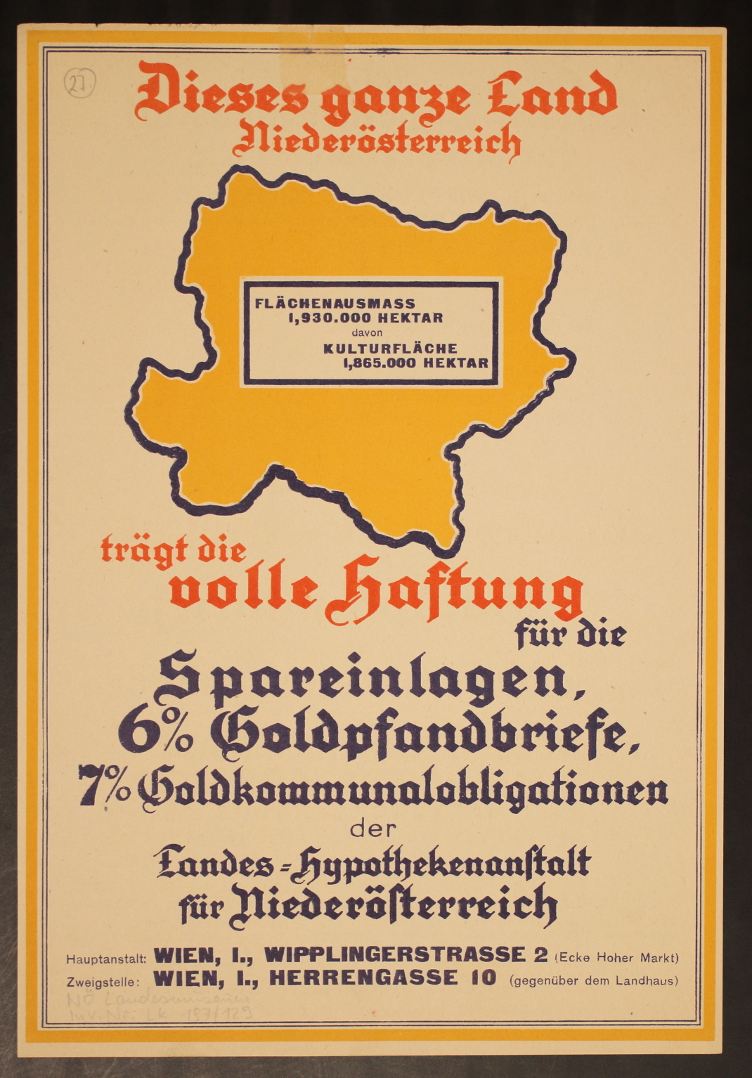 Gelb umrandetes Blatt mit blau-gelber Darstellung des Bundeslandes Niederösterreich. In der Mitte der Darstellung eine eingesetzte Kartusche mit Text: „Flächenausmass 1,930.000 Hektar, davon Kulturfläche 1,865.000 Hektar“, weiters blauer und roter Text: „ Dieses ganze Land Niederösterreich trägt die volle Haftung für die Spareinlagen, 6% Goldpfandbriefe, 7% Goldkommunalobligationen der Landes-Hypothekenanstalt für Niederösterreich“ ausgestellt von der Landeshypothekenanstalt NÖ, Goldpfandbriefe, Reklamedruck.