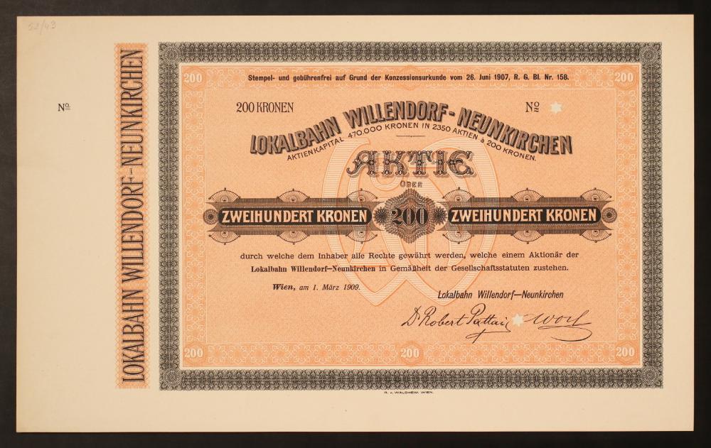„Stempel- und gebührenfrei auf Grund der Konzessionsurkunde vom 26. Juni 1907, R. G. Bl. Nr. 158. 200 Kronen, No. [gelocht, keine Nummer]. Lokalbahn Willendorf-Neunkirchen. Aktienkapital 470.000 Kronen in 2350 Aktien à 200 Kronen. Aktie über Zweihundert 200 Kronen durch welche dem Inhaber alle Rechte gewährt werden, welche einem Aktionär der Lokalbahn Willendorf-Neunkirchen in Gemässheit der Gesellschaftsstatuten zustehen. Wien, am 1. März 1909. Lokalbahn Willendorf-Neunkirchen: Dr. Robert Pattai, Worl [?, unleserlich]“.