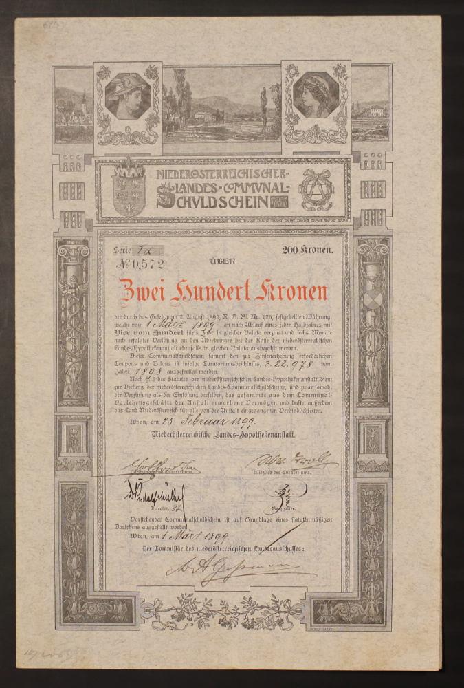 Serie IX, No. 0,572 über Zweihundert 200 Kronen der durch das Gesetz vom 2. August 1892, R.G.Bl. Nr. 126, festgestellten Währung, welche vom 1. März 1899 an nach Ablauf eines jeden Halbjahres mit Vier vom hundert für's Jahr in gleicher Valuta verzinst und sechs Monate nach erfolgter Verlosung an den Überbringer bei der Kasse der niederösterreichischen Landes-Hypothekenanstalt ebenfalls in gleicher Valuta ausbezahlt werden. Dieser Communalschuldschein sammt den zur Zinsenerhebung erforderlichen Coupons und Talons ist infolge Curatoriumsbeschlusses, Z. 22.978 vom Jahre 1898 ausgefertigt worden. Nach § 5 des Statutes der niederösterreichischen Landes-Hypothekenanstalt dient zur Deckung der niederösterreichischen Landes-Communalschuldscheine, und zwar sowohl der Verzinsung als der Einlösung derselben, das gesammte aus dem Communal-Darlehensgeschäfte der Anstalt erworbene Vermögen und haftet außerdem das Land Niederösterreich für alle von der Anstalt eingegangenen Verbindlichkeiten. Wien, am 25. Februar 1899. Niederösterreichische Landes-Hypothekenanstalt ... [Unterschriften unleserlich].