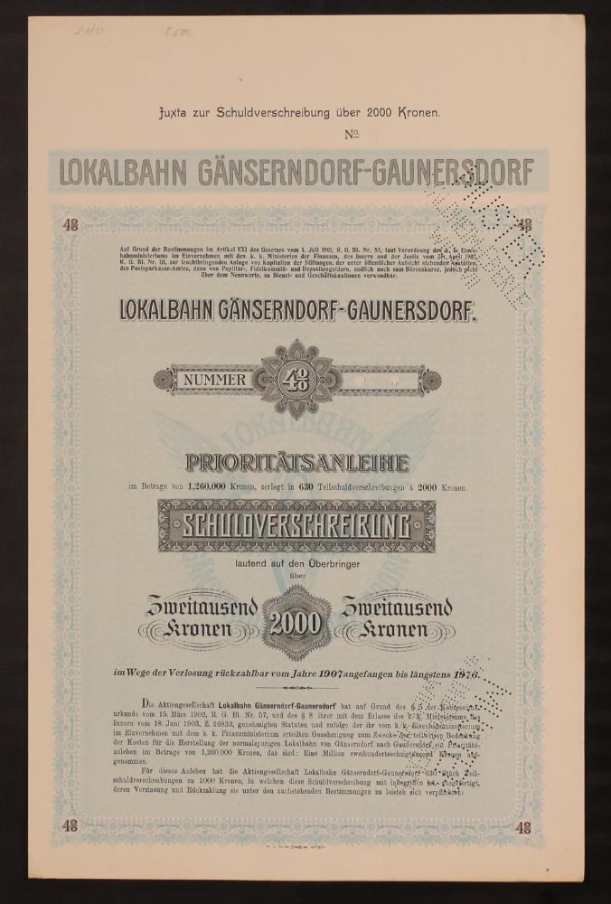 Schuldverschreibung Lokalbahn Gänserndorf-Gaunersdorf, 2.000 Kronen