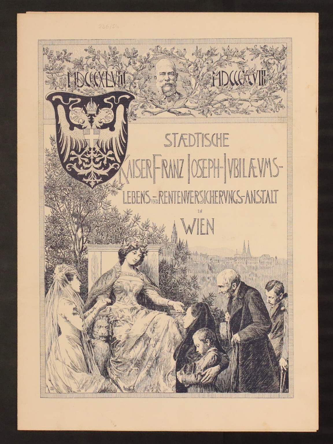 Staedtische Kaiser Franz Joseph-Jubiläums Lebens- und Rentenversicherungs-Anstalt ist heute Wr.Städtische Versicherung. Dekorativ, Abbildungen Kaiser, Doppeladler, Stephansturm, Wr.Rathaus. Ab- und Erlebensversicherung über 2.000 Kronen des Hr. Franz Nemecek, Wien, vierteljährliche Prämie über 23 Kronen.