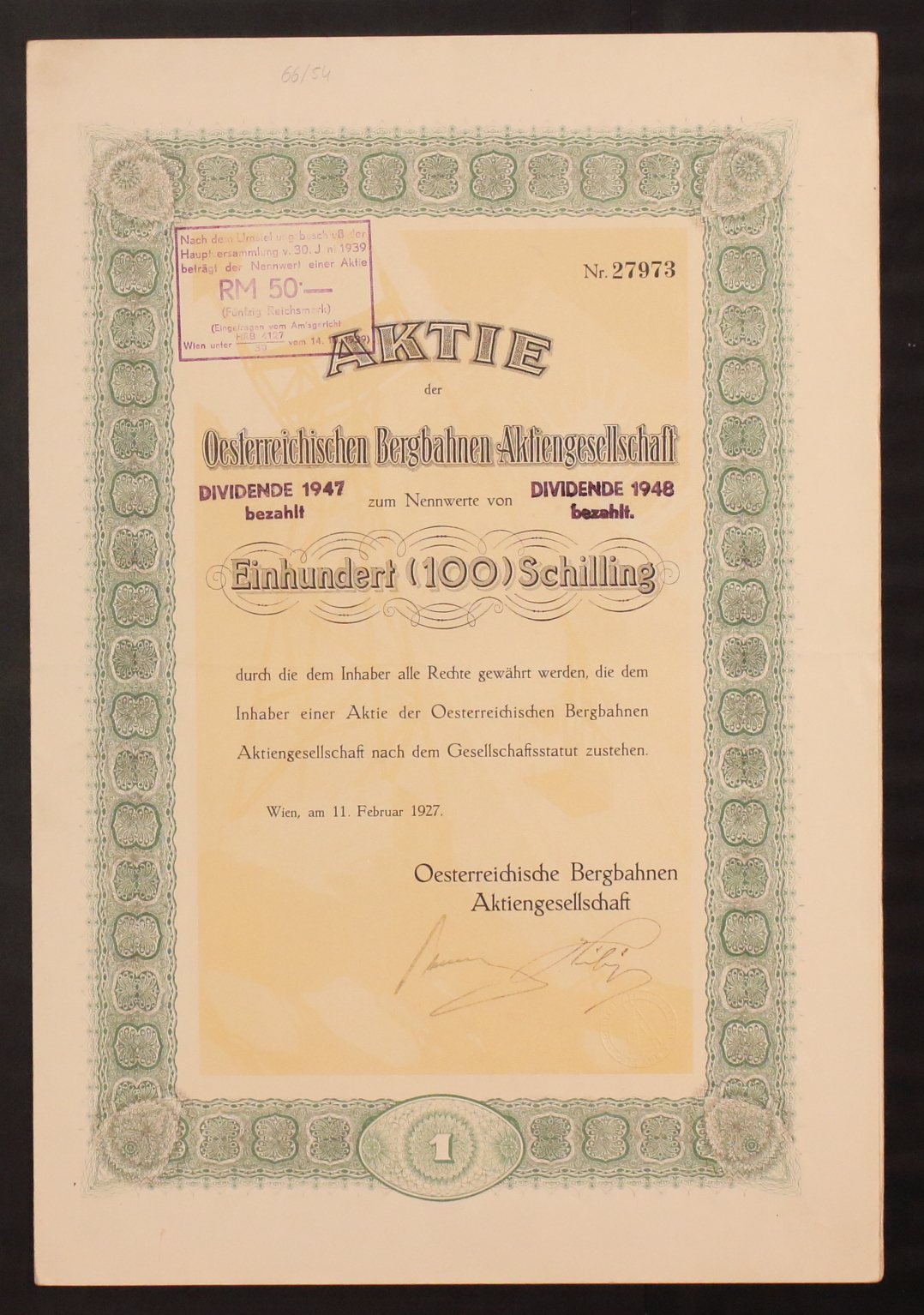Aktie Nr.27973. Aktie der Oesterreichischen Berbahnen-Aktiengesellschaft zum Nennwerte von Einhundert (100) Schilling durch die dem Inhaber alle Rechte gewährt werden, die dem Inhaber einer Aktie der Oesterreichischen Bergbahnen Aktiengesellschaft nach dem Gesellschaftsstatut zustehen. Wien, am 11. Februar 1927. Oesterreichische Bergbahnen-Aktiengesellschaft. [Unterschriften unleserlich].
