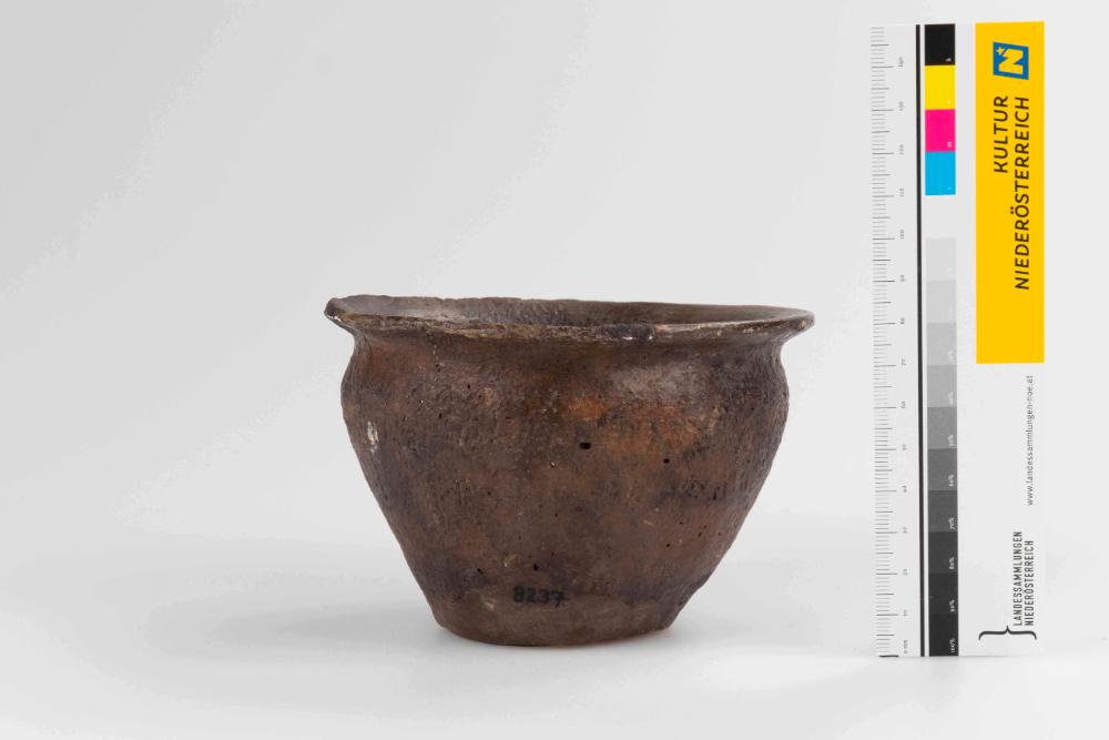 Gefäß aus dunkelbraun gebranntem, relativ feinem Ton, handgeformt mit gering geglätteter Oberfläche. Mundsaum trichterförmig ausladend, Standfläche gut abgesetzt, darauf eine halbplastisch abgesetzte Bodenmarke, ein Kreuz in einem Kreis. An der Schulter ein schwach erkennbares Linienbündel.