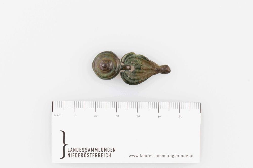 Herzförmiger Anhänger, bestehend aus zwei Teilen: einer kugelsegmentförmigen Scheibe und einem Unterteil in Herzform. Die Oberseite der Scheibe ist profiliert mit stark hervortretendem Zentrum. An der Unterseite zwei Ösen zum Befestigen auf einer organischen Unterlage, eine dritte zum Einhängen des Anhängers. Die Rückseite der Anhänger ist flach, die Oberseite mit einem an die Umrisslinien angepassten Muster versehen.