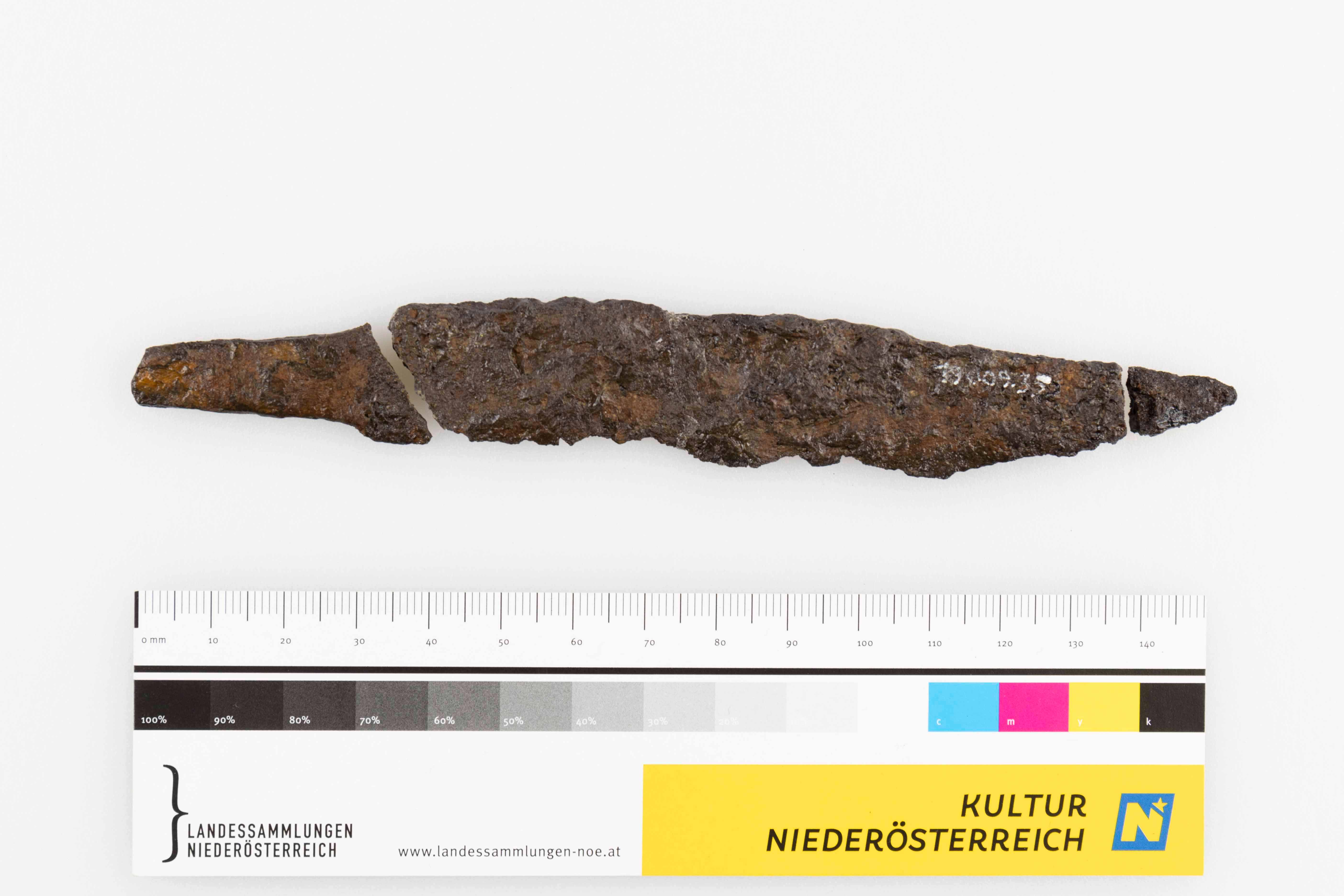 Griffangelmesser aus Eisen, gut abgesetzter, geschwungener Rücken, Schneide zur Spitze hin gebogen. Zerbrochen in drei Teile