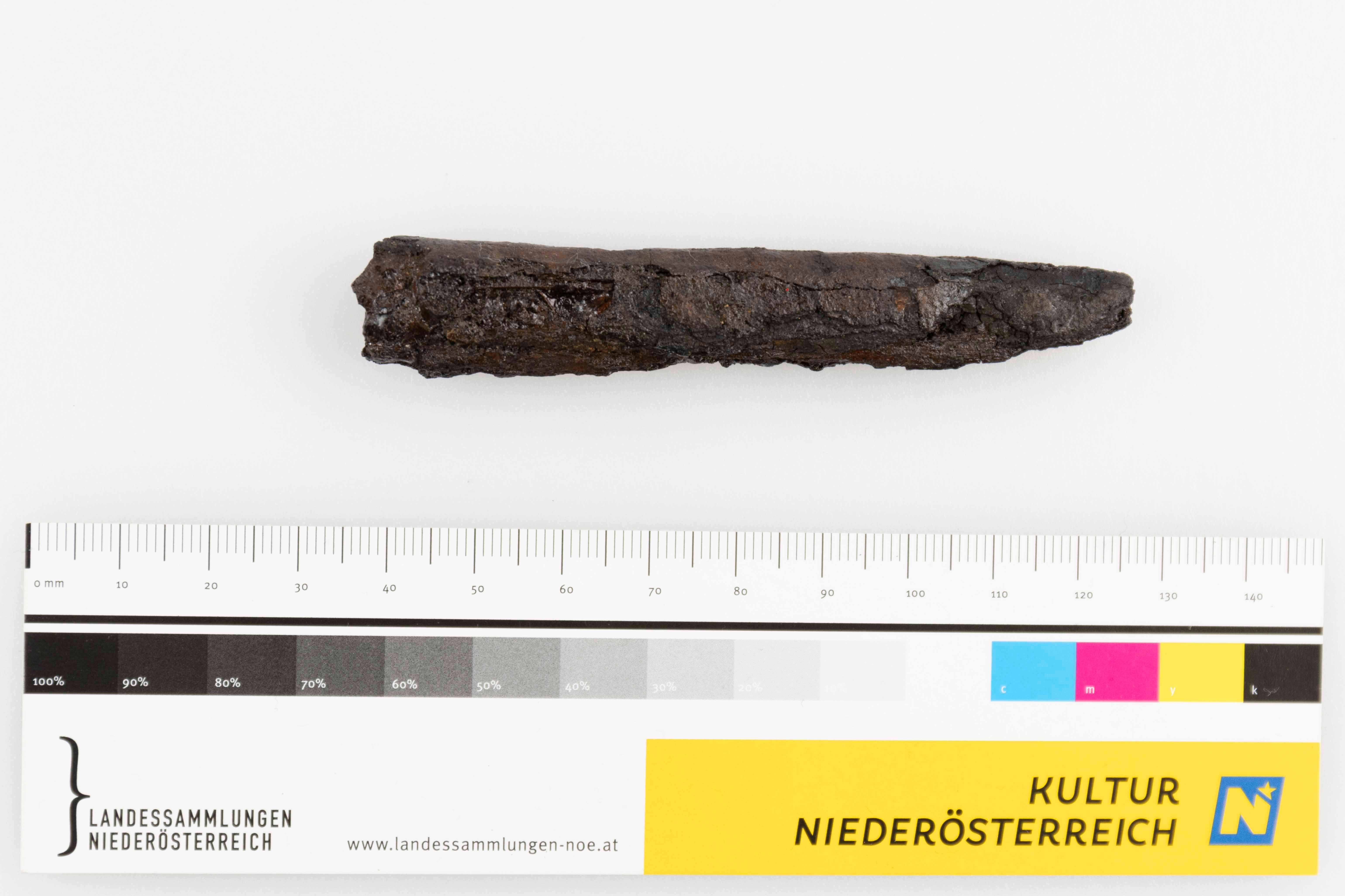 Messer, Eisen, mit ankorrodierten Resten einer hölzernen Scheide. Gerader Rücken, gebogene Schneide, Griffangel fehlt.