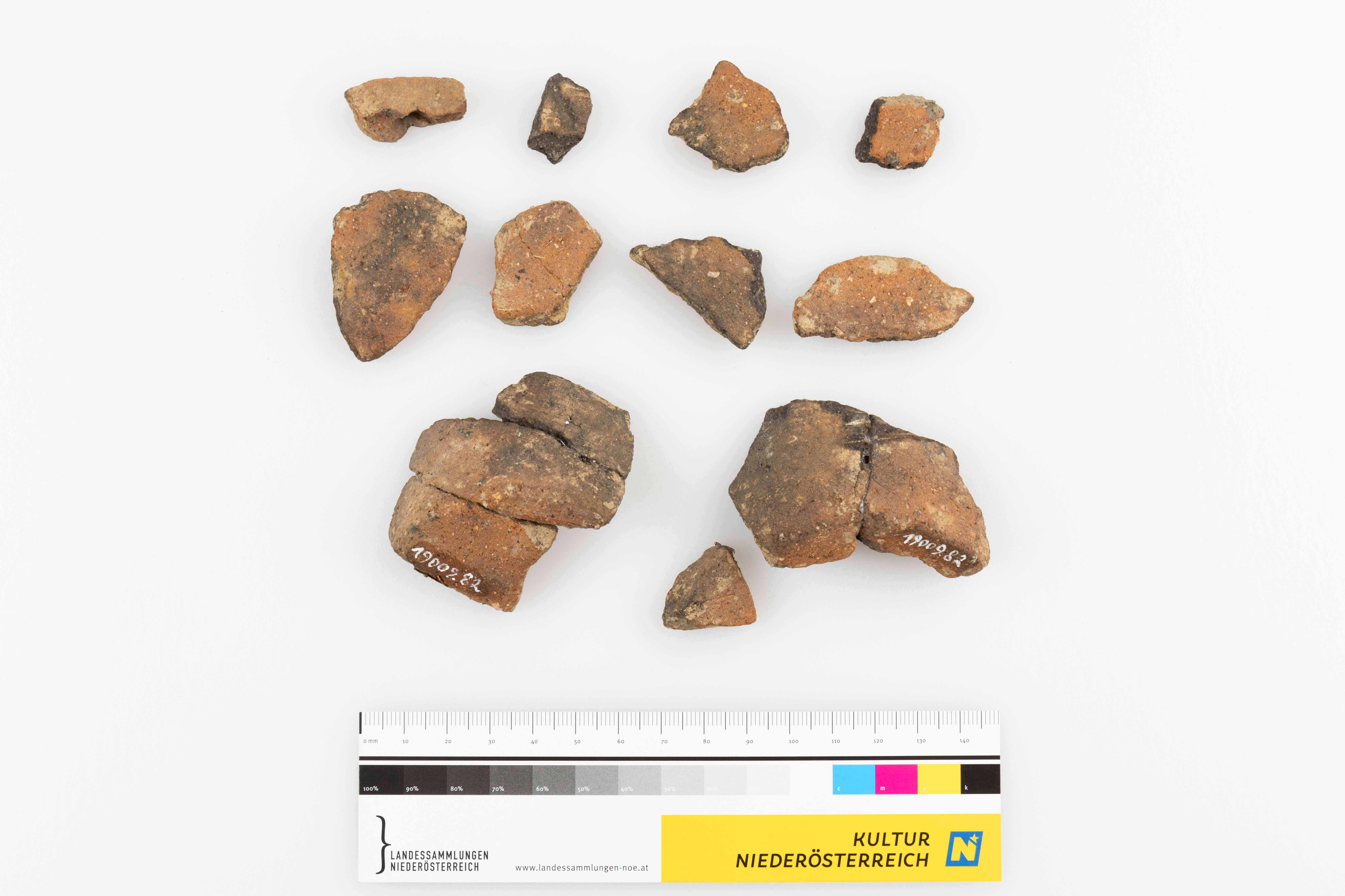 Boden- und Wandbruchstücke eines kleinen Gefäßes. Quarzsteinchengemagerter, reichlich glimmerhältiger, orange bis graubraun, hart gebrannter Ton. Ebene Standfläche, steilkonischer Körper.