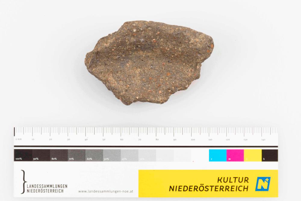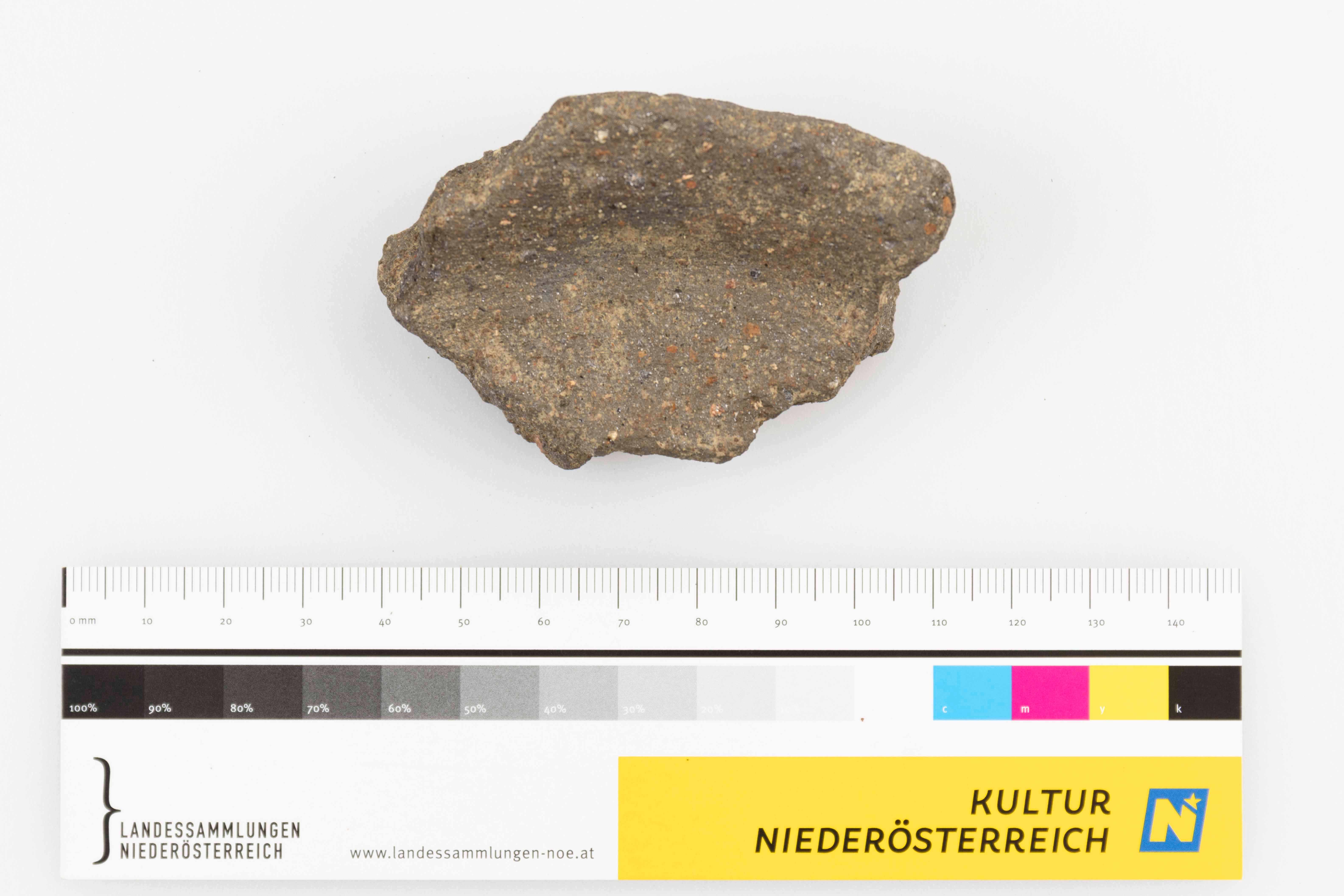 Bruchstück eines Tellers aus stark grafitiertem, reichlich quarzsteinchen- und glimmergemagertem, sehr hart gebranntem Ton mit rötlichen Einschlüssen. Ebene Standfläche, konische Wand.