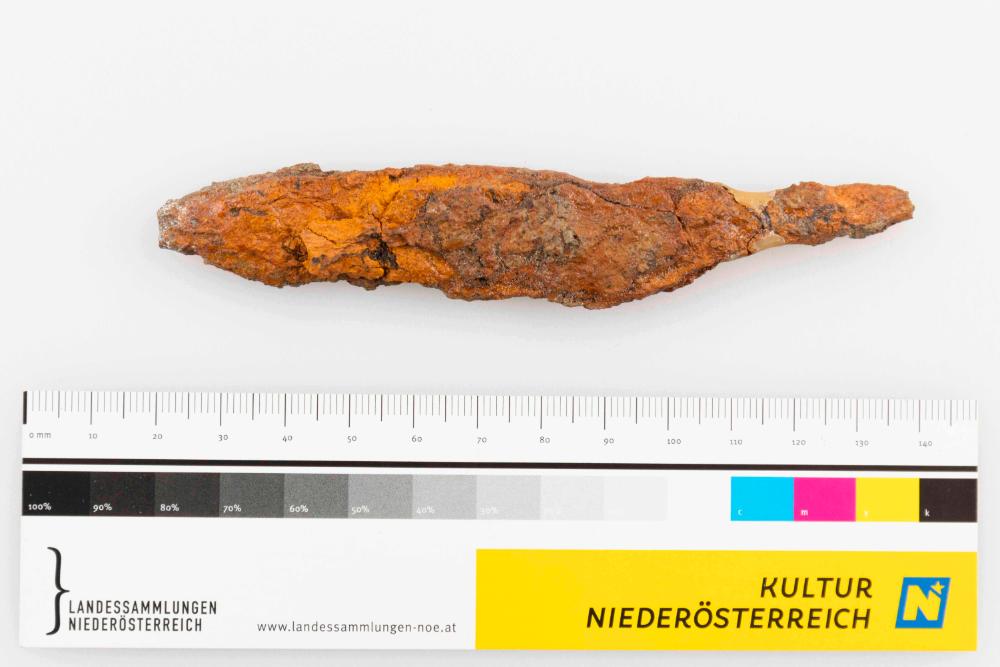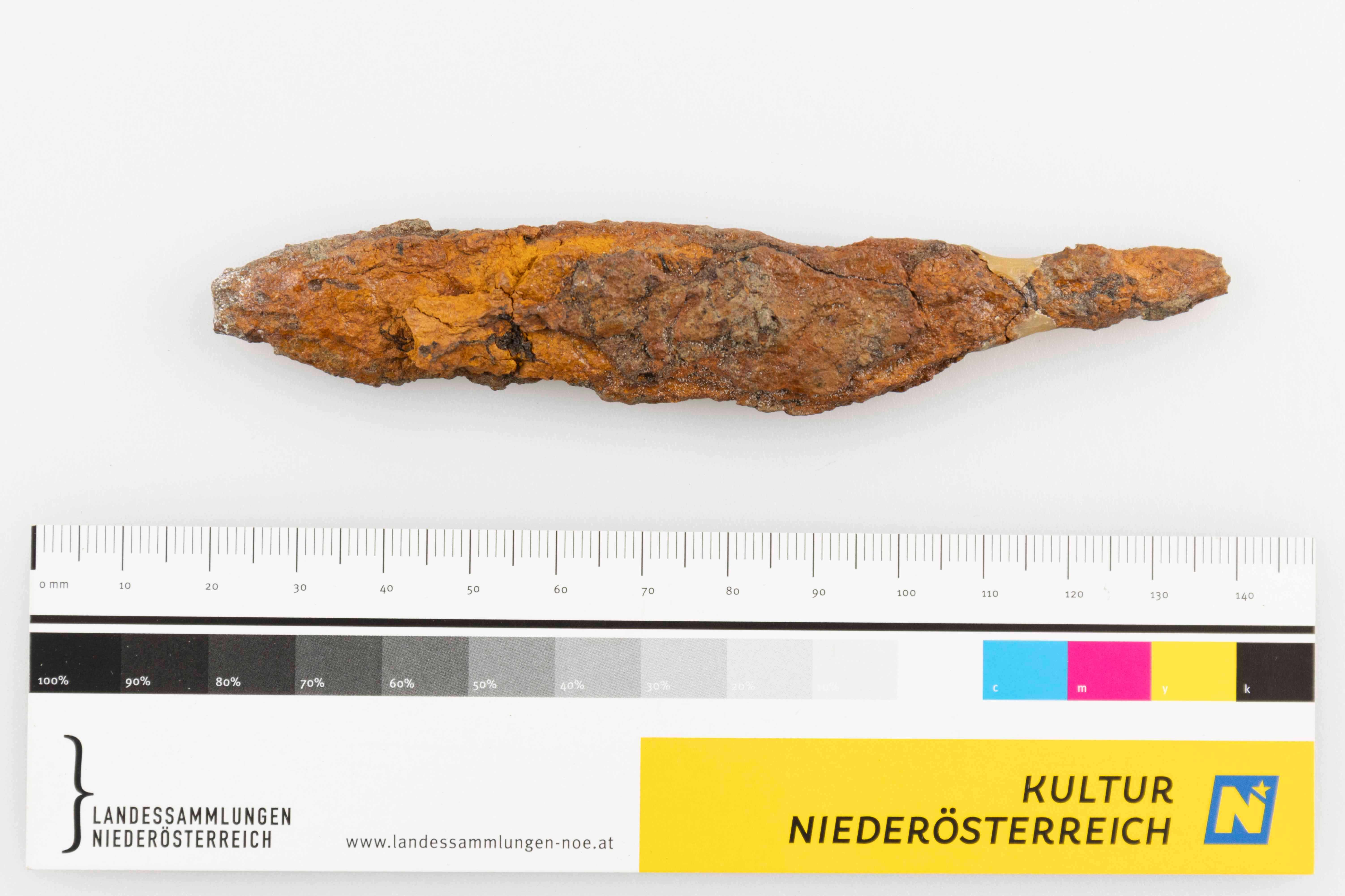Kleines, eisernes Griffangelmesser, Spitze und Teil der Griffangel abgebrochen. Abgesetzte Schneide, gerader Rücken.