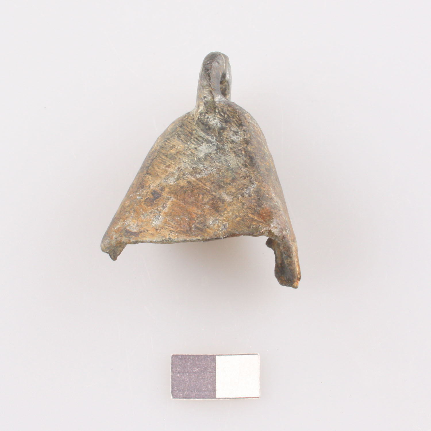 Glocke, pyramidenförmiger Körper, Öse mitgegossen, beschädigt, Klöppel fehlt