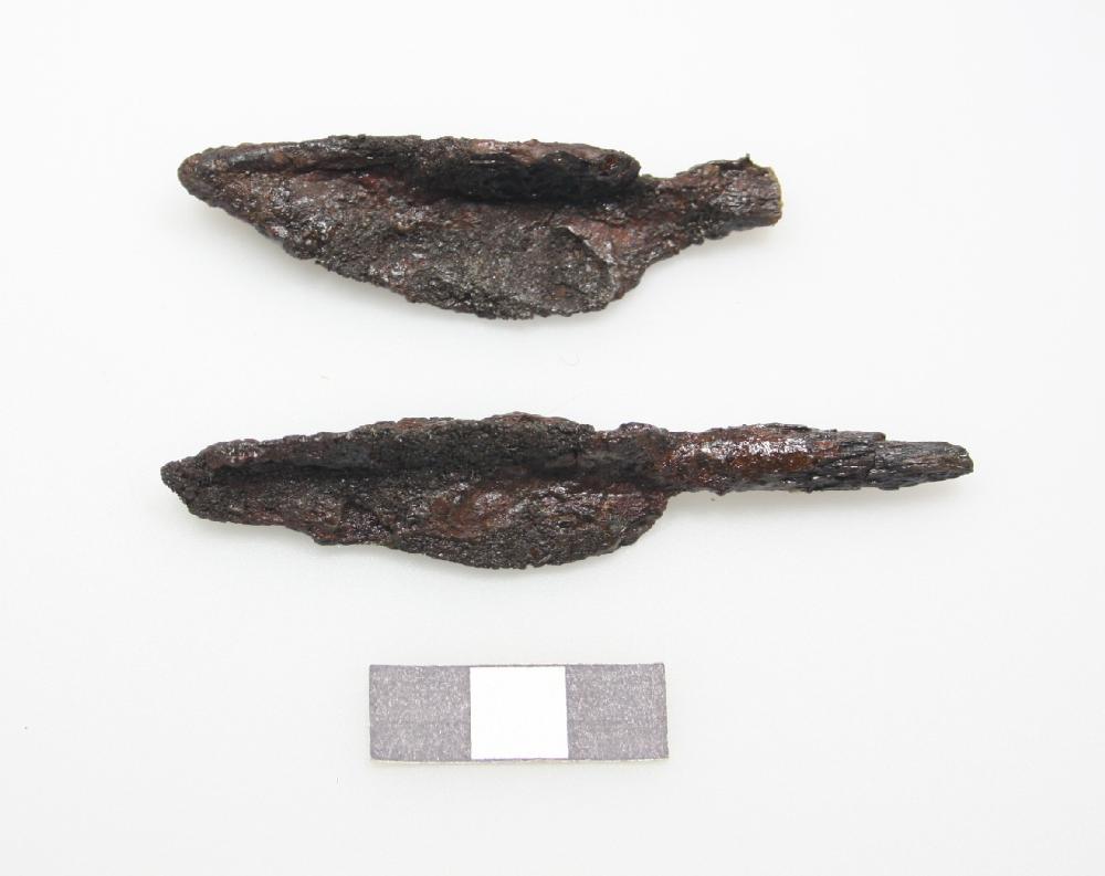 Zwei dreiflügelige Pfeilspitzen, Holzreste der Schäfte an den Dornen, teilweise Umwicklung der Schäfte erkennbar