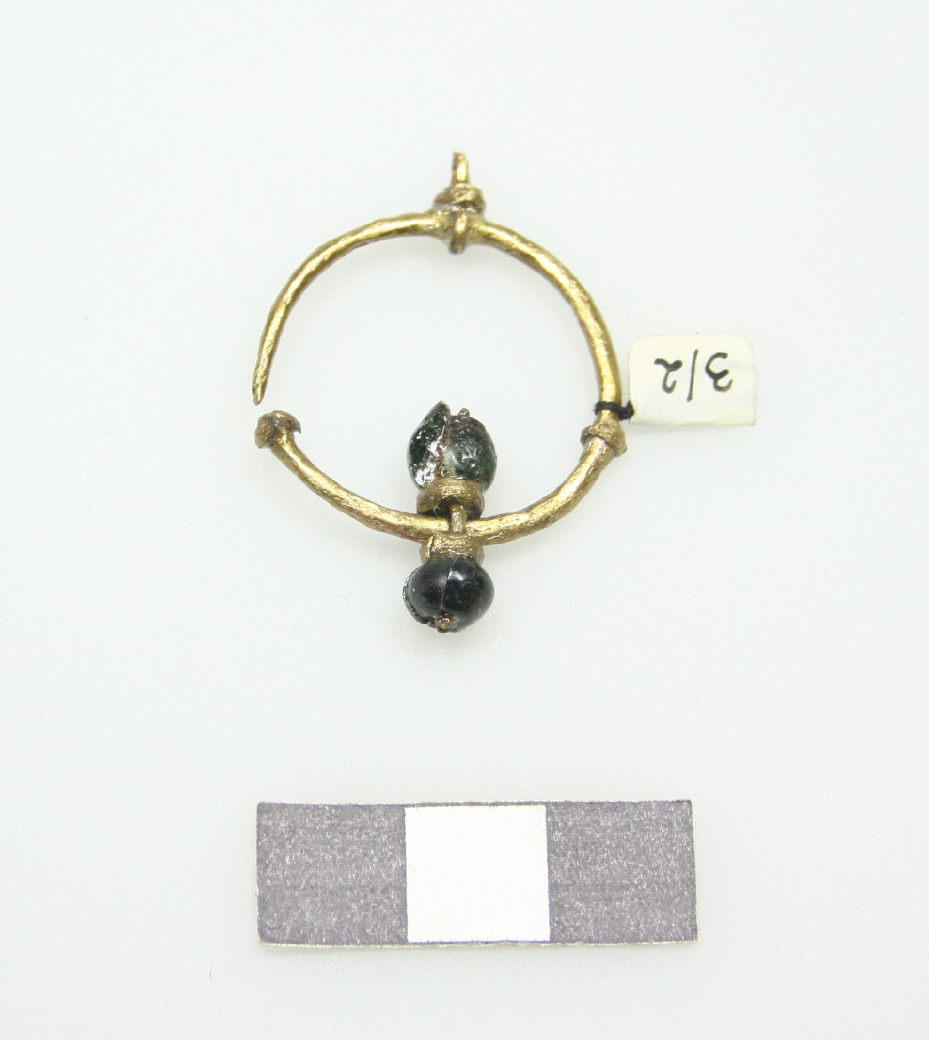 Rundstabiger Kopfschmuckring, Buntmetall, mit schwarzem Glasperlenanhänger, eine Perle fehlt; zwei aufgeschlaufte Buntmetallringe