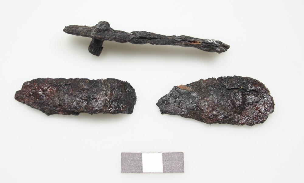 Drei Teile einer Sargklammer wie 19018.035.A.1.1: L 8,5, 5,9 bzw 5,9, B 2,4, 1,8 bzw 2,6, D 0,5-0,8, L eines erh Nagels 1,8 cm