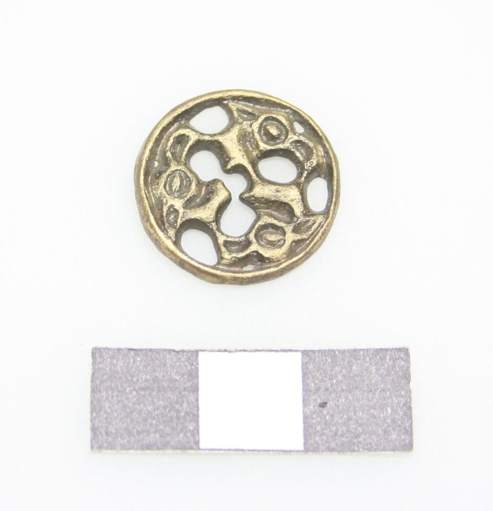 Rosettenförmiger Gürtelbeschlag, Buntmetall durchbrochen gegossen, mit drei Vogel- oder Greifenköpfen verziert.; Dm 2-2,1, D 0,15-0,2, Gewicht 1,3-1,5 g; zusammen 17,1 g