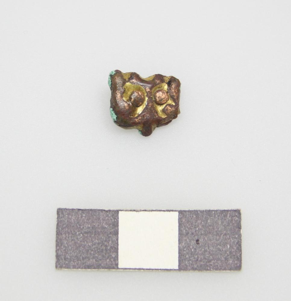 Nebenriemenbeschlag, "kleiner Lochschützer", aus gepreßtem Buntmetallblech, vergoldet, mit undeutlicher Rankenzier