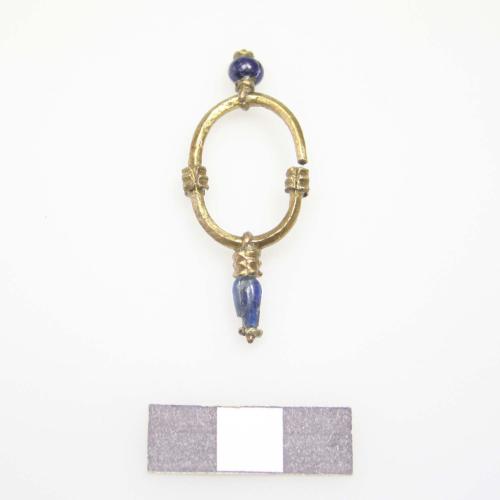 Sauber gearbeiteter, ovaler, offener Kopfschmuckring aus vierkantigem Buntmetalldraht mit zwei aufgezogenen, mehrfach genoppten Buntmetallhülsen (Granulationsimitation). Unten längliche, oben runde, blaue Glasperlenzier. Zwischen länglicher Glasperle und Ring ebenfalls genoppte Buntmetallhülse. Jeweils an den äußeren Enden der Perlen genoppter Beilagring. Eine der länglichen Perlen ist der Länge nach gesprungen, sosaß das Buntmetallröhrchen freiliegt, an dem der Glasschmelz unmittelbar haftet