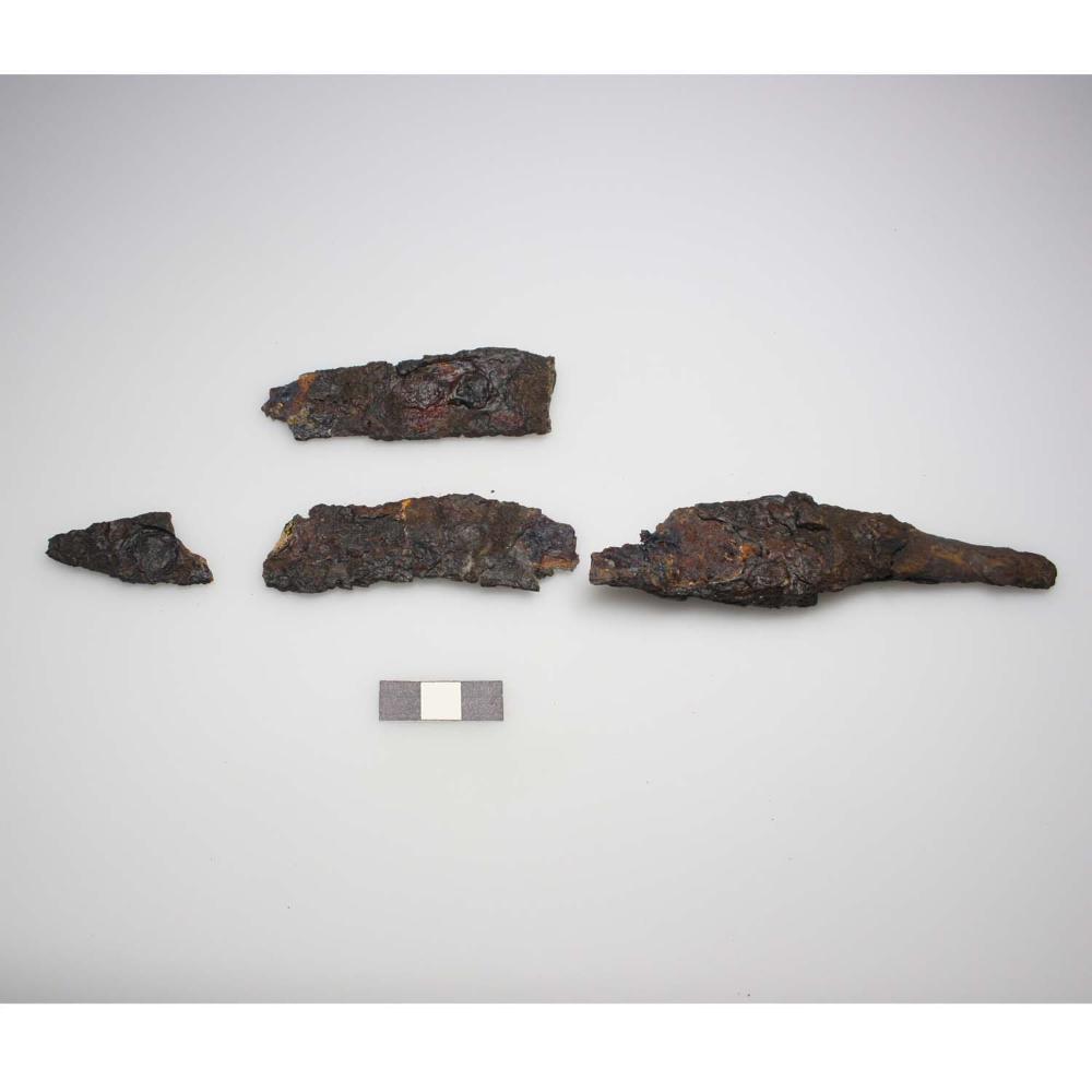 Diverse Fragmente eines langen Eisenmessers mit ankorrodiertem, eisernem Band am Heft (Scheidenmundblech?) und anhaftenden Holzresten am Griff; Ehem. L 31,8, B beim Heft 3,1, B Heft 1,3 cm.