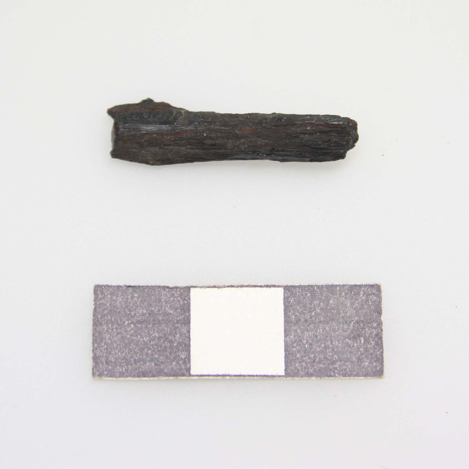 Längliches Eisenfragment, wohl Teil einer Pfeilspitze, mit ankorrodierten Holzresten