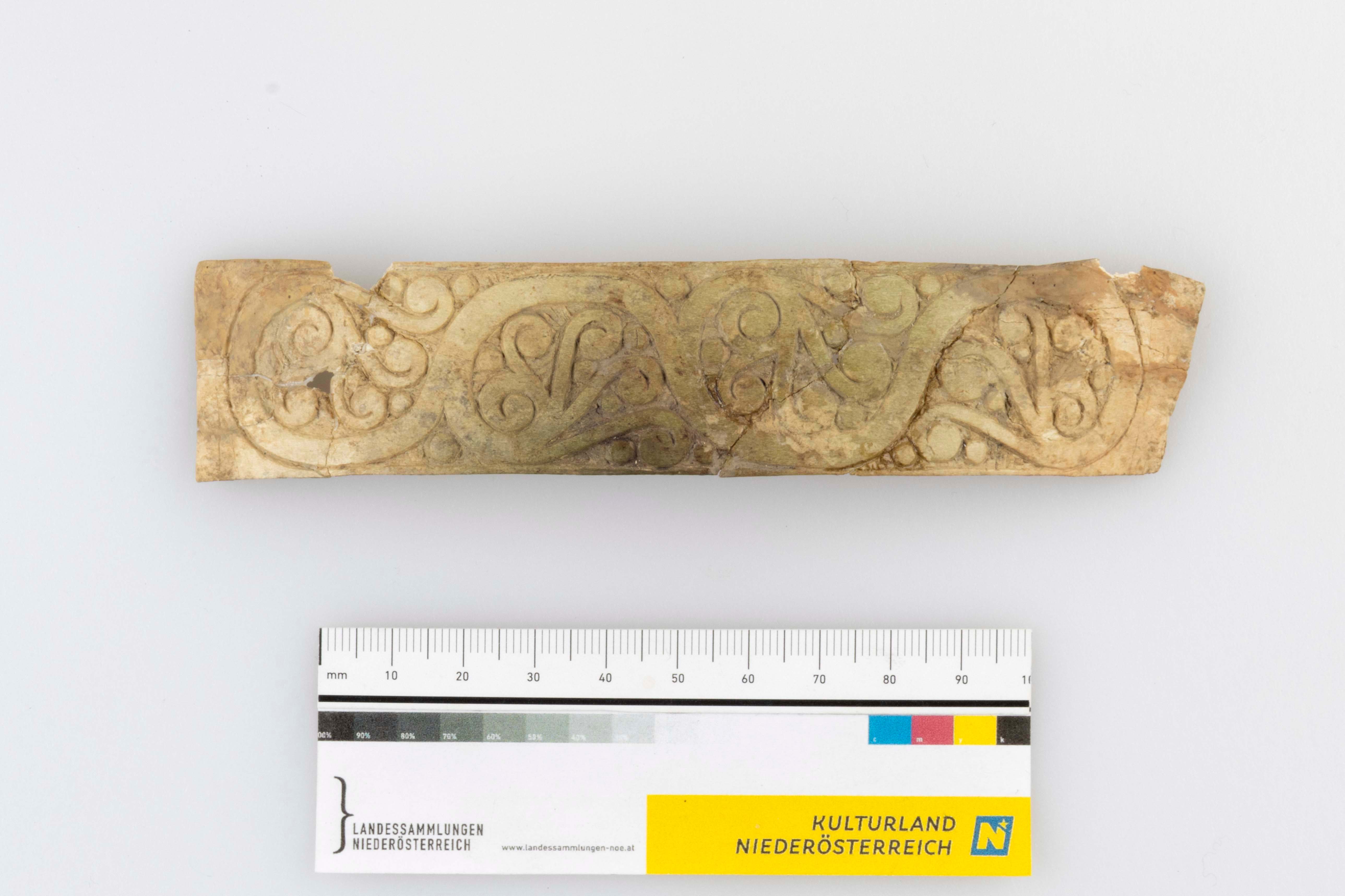 Eine rechteckige, stark gewölbte Knochenplatte. Die Vorderseite des Objekts zeigt eine tief und präzise eingravierte Rankenzier, wobei jede Ranke in fünf kleinen kreisförmigen Lappen endet. Möglicherweise handelt es sich um ein dekoratives Element eines Köchers.