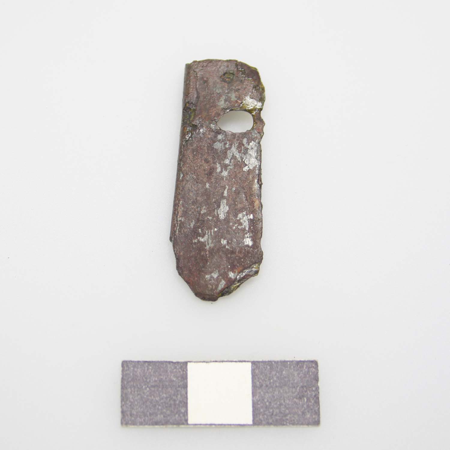 Vorderblech einer Riemenzunge aus Buntmetallblech, Schauseite verzinnt, Rand umgebörtelt, am oberen Ende eine Niete.