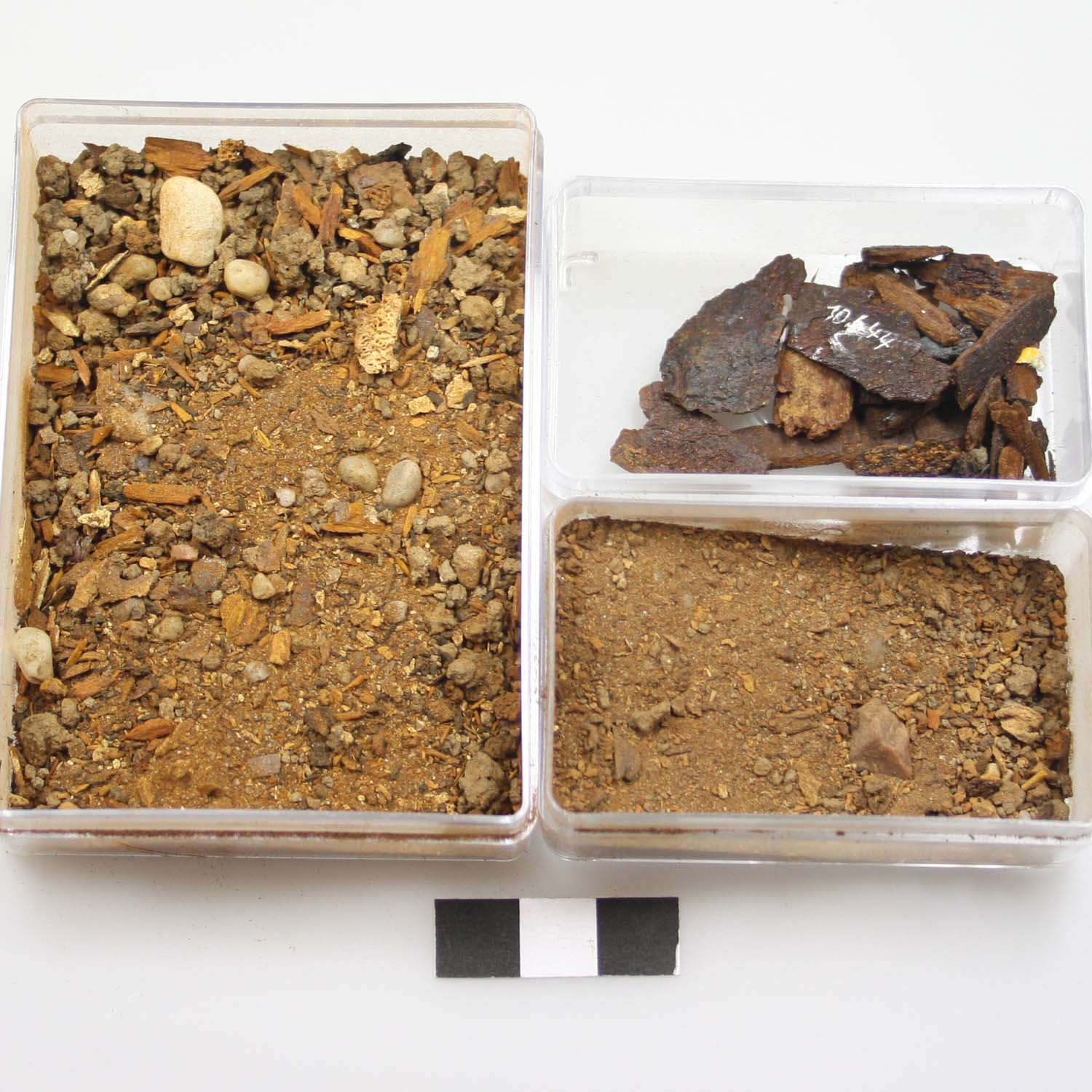 Sargreste, darunter ein etwa 4 cm langer Span mit zwei eingeschnittenen Kerben (heute viele Fragmente)