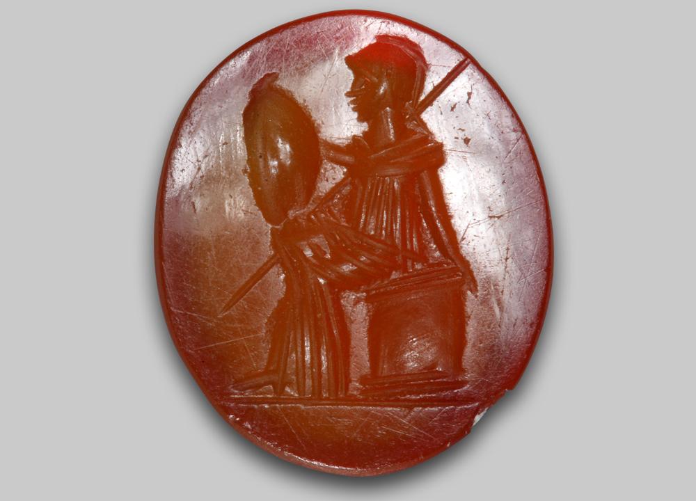 Roma behelmt, bekleidet mit einem langen Chiton sitzt auf einem Altar. Sie hält mit der Rechten einen auf ihren Knien aufgestellten Schild und stützt sich mit der Linken auf den Altar. Über ihrer rechten Schulter eine schräggestellte Lanze.
