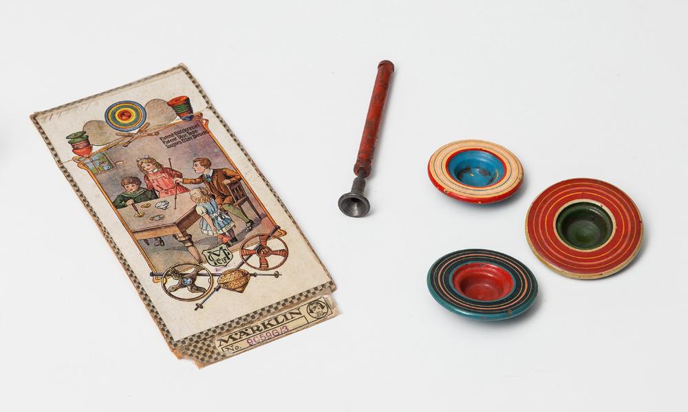 Beschäftigungsspiel mit Drillstab und 3 Tellerförmigen Kreiseln, Fa. Märklin & Cie, No. 9059G/3, Made in Germany
